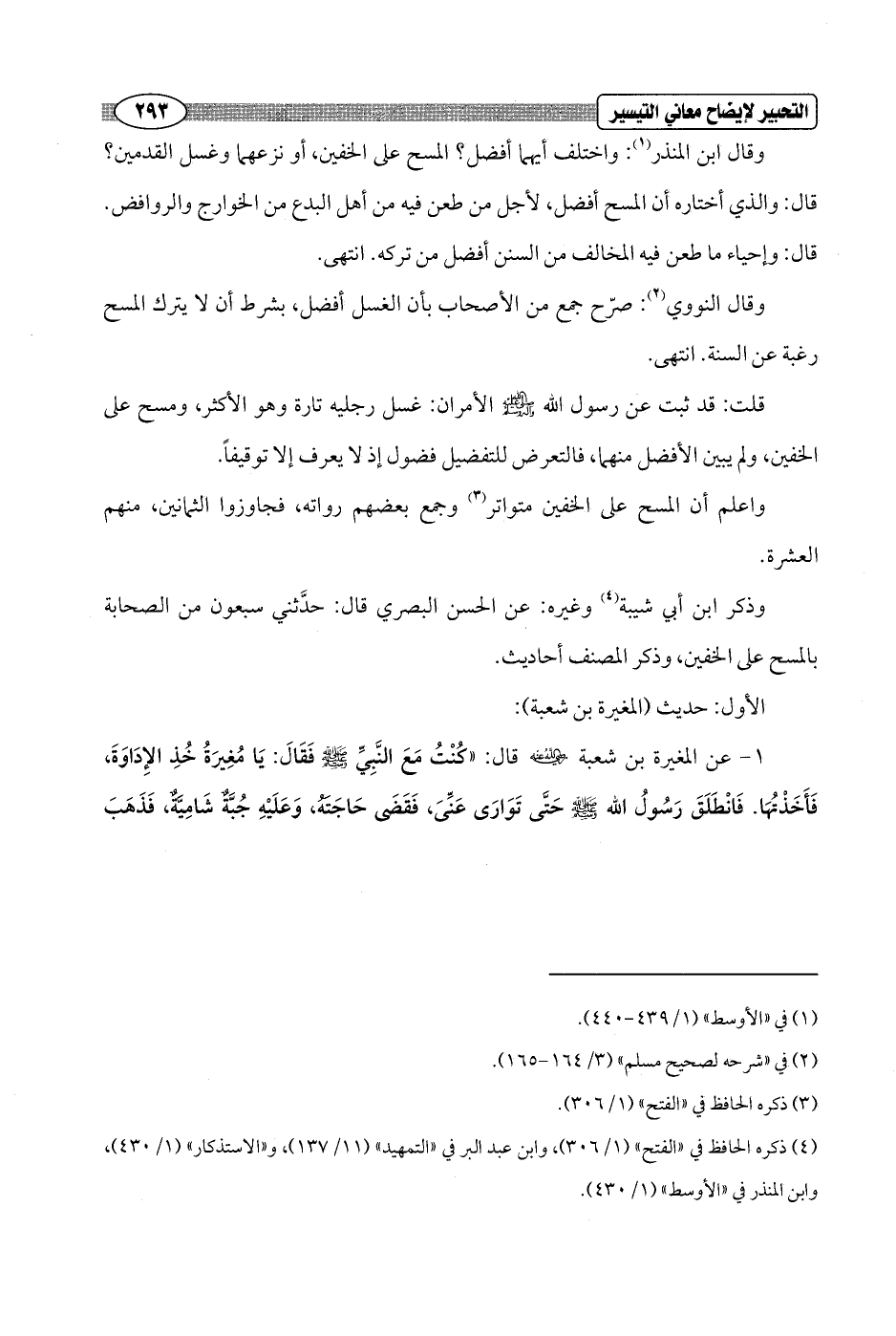 وقال ابن المنذر (¬1): واختلف أيهما أفضل؟ المسح على الخفين، أو نزعهما وغسل القدمين؟ قال: والذي أختاره أن المسح أفضل، لأجل من طعن فيه من أهل البدع من الخوارج والروافض. قال: وإحياء ما طعن فيه المخالف من السنن أفضل من تركه. انتهى.