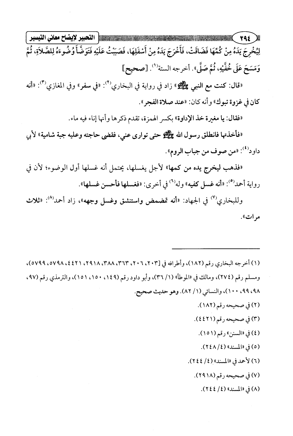لِيُخْرِجَ يَدَهُ مِنْ كُمِّهَا فَضَاقَتْ، فَأَخْرَجَ يَدَهُ مِنْ أَسْفَلِهَا، فَصَبَبْتُ عَلَيْهِ فَتَوَضَّأَ وُضُوءَهُ لِلصَّلاَةِ، ثُمَّ وَمَسَحَ عَلَى خُفَّيْهِ, ثُمَّ صَلَّى". أخرجه الستة (¬1). [صحيح]