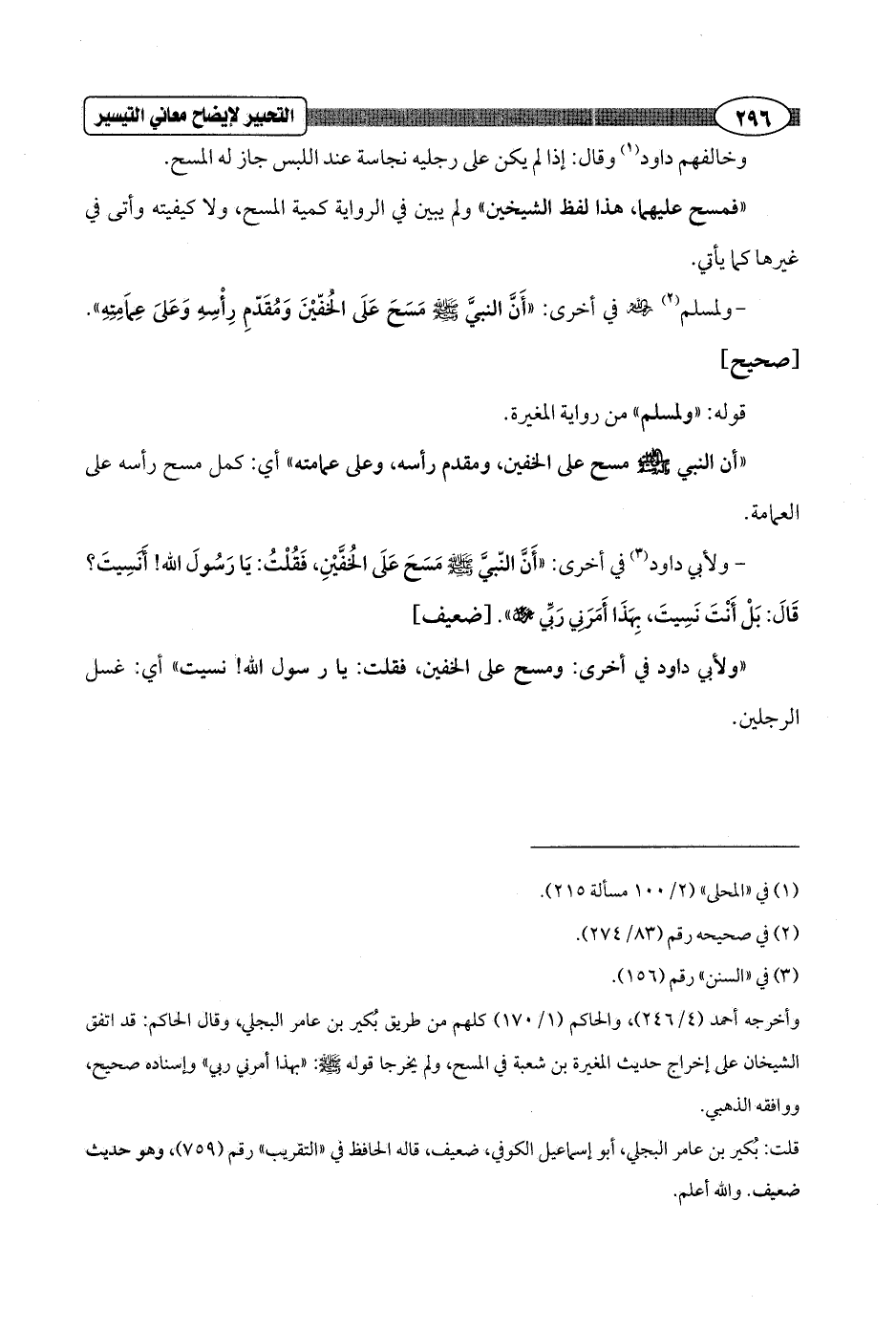 - ولمسلم (¬2) - رحمه الله - في أخرى: "أَنَّ النبيَّ - صلى الله عليه وسلم - مَسَحَ عَلَى الخُفّيْنَ وَمُقَدّمِ رِأْسِهِ وَعَلىَ عِماَمِتِهِ". [صحيح]