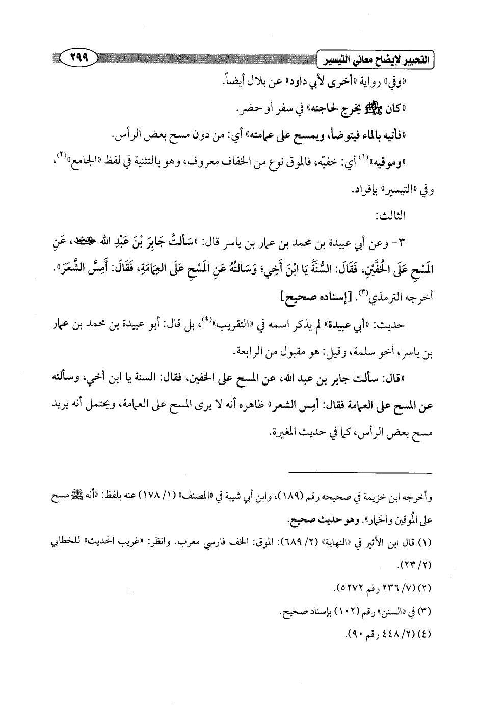 3 - وعن أبي عبيدة بن محمد بن عمار بن ياسر قال: "سَألتُ جَابِرَ بْنَ عَبْدِ الله - رضي الله عنهما -، عَنِ المَسْحِ عَلَى الخُفَّيْنِ، فَقَالَ: السُّنَّةُ يَا ابْنَ أَخِي؛ وَسَالتُهُ عَنِ المَسْحِ عَلَى العِمَامَةِ، فَقَالَ: أَمِسَّ الشَّعَرَ". أخرجه الترمذي (¬3). [إسناده صحيح]