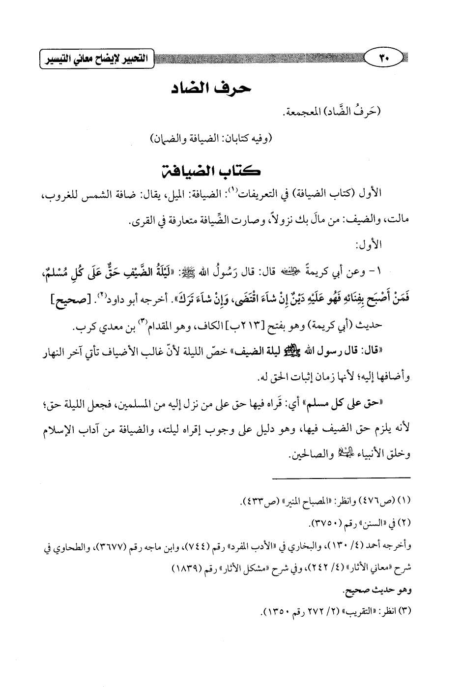 1 - وعن أبي كريمةً - رضي الله عنه - قال: قال رَسُولُ الله - صلى الله عليه وسلم -: "لَيْلَةُ الضَّيْفِ حَقٌّ عَلَى كُلِ مُسْلمٌ، فَمَنْ أَصْبَح بِفِنَائهِ فَهُو عَلَيْهِ دَيْنٌ إِنْ شاَءَ اقْتَضَى، وَإِنْ شاَءَ تَرَكَ". أخرجه أبو داود (¬2). [صحيح]
