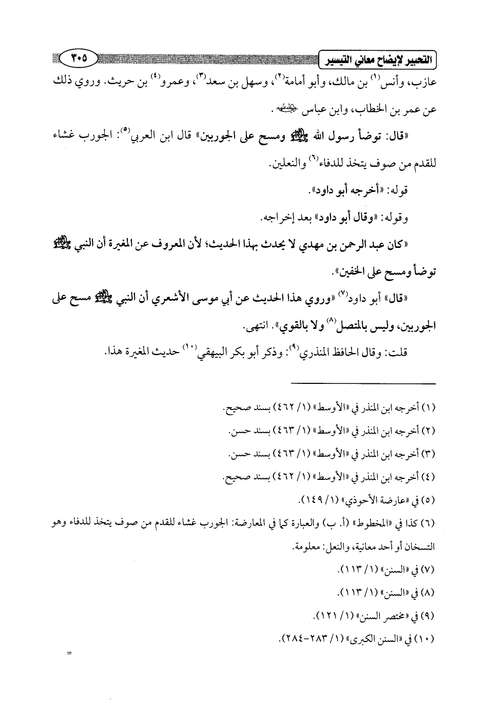 "قال: توضأ رسول الله - صلى الله عليه وسلم - ومسح على الجوربين" قال ابن العربي (¬5): الجورب غشاء للقدم من صوف يتخذ للدفاء (¬6) والنعلين.