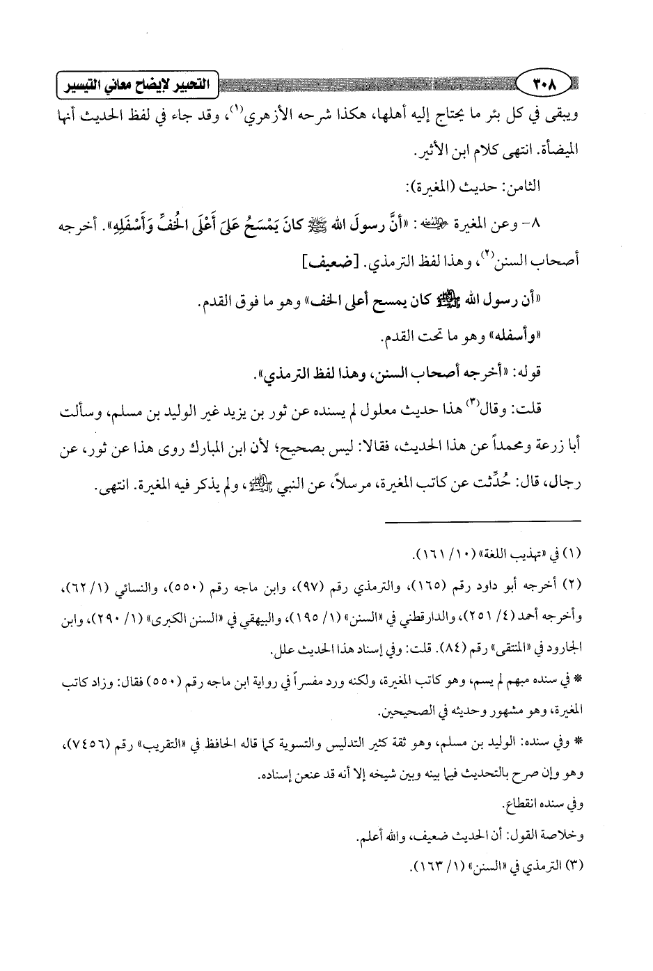 8 - وعن المغيرة - رضي الله عنه -: "أنَّ رسولَ الله - صلى الله عليه وسلم - كانَ يَمْسَحُ عَلىَ أَعْلَى الخُفِّ وَأَسْفَلِهِ". أخرجه أصحاب السنن (¬2)، وهذا لفظ الترمذي. [ضعيف]
