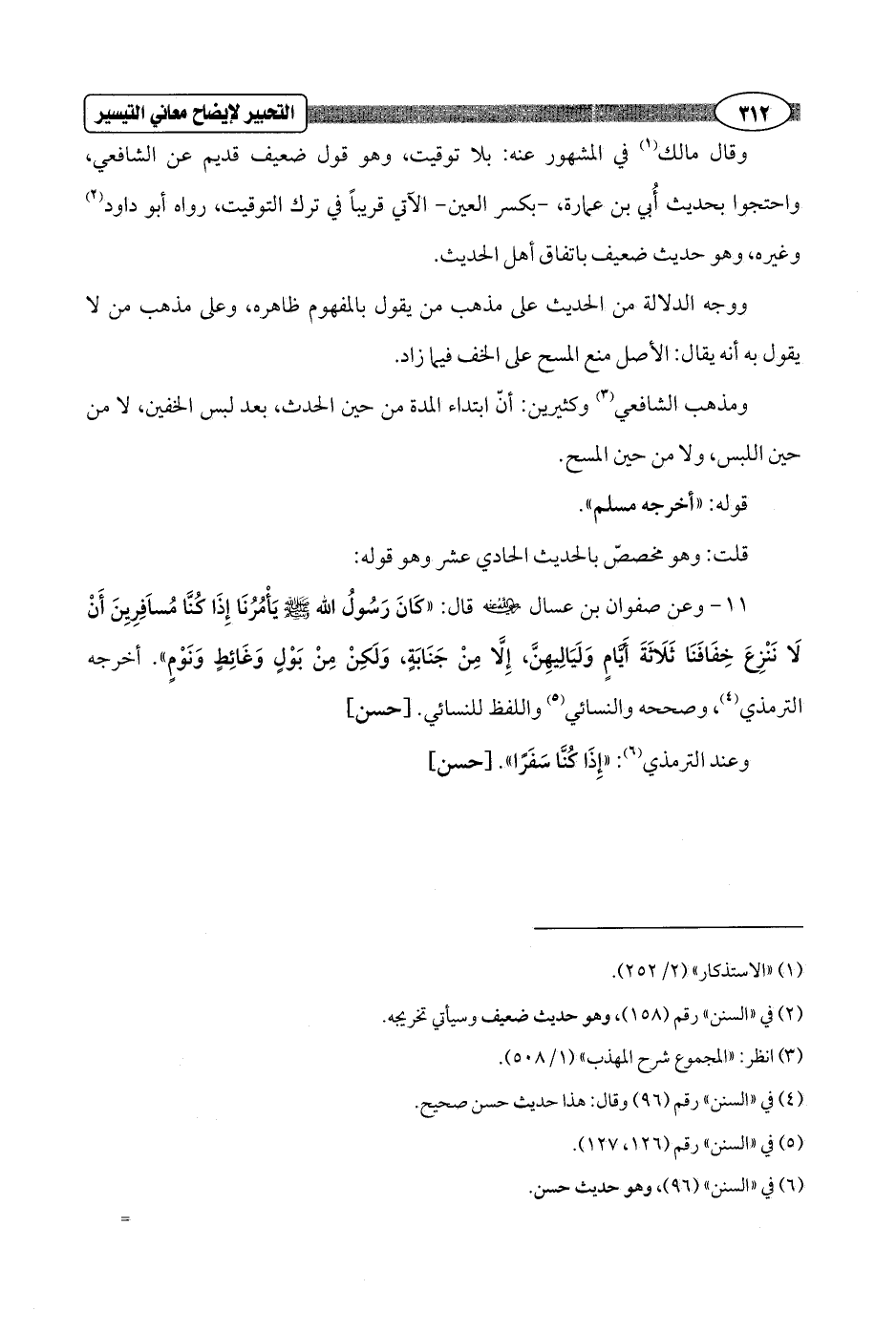 11 - وعن صفوان بن عسال - رضي الله عنه - قال: "كَانَ رَسُولُ الله - صلى الله عليه وسلم - يَأْمُرُنَا إِذَا كُنَّا مُساَفِرِيِنَ أَنْ لَا نَنْزِعَ خِفَافَنَا ثَلَاَثةَ أَيَّامٍ وَلَيَالِيهِنَّ، إِلَّا مِنْ جَنَابَةٍ، وَلَكِنْ مِنْ بَوْلٍ وَغَائِطٍ وَنَوْمٍ". أخرجه الترمذي (¬4)، وصححه والنسائي (¬5) واللفظ للنسائي. [حسن]