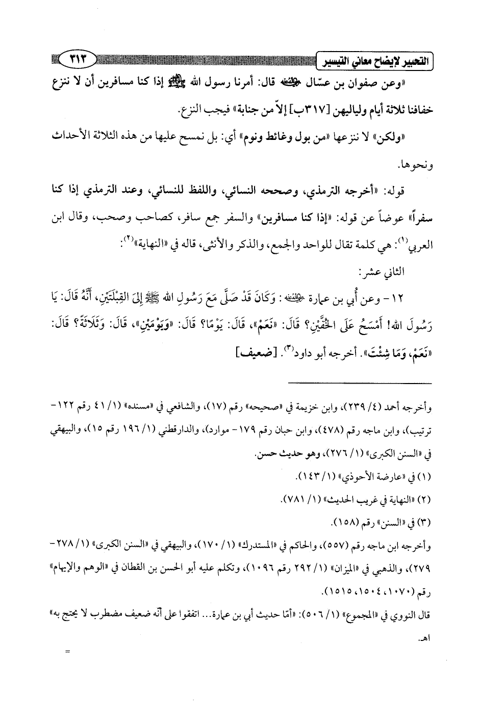 قوله: "أخرجه الترمذي، وصححه النسائي، واللفظ للنسائي، وعند الترمذي إذا كنا سفراً" عوضاً عن قوله: "إذا كنا مسافرين" والسفر جمع سافر، كصاحب وصحب، وقال ابن العربي (¬1): هي كلمة تقال للواحد والجمع، والذكر والأنثى، قاله في "النهاية" (¬2):