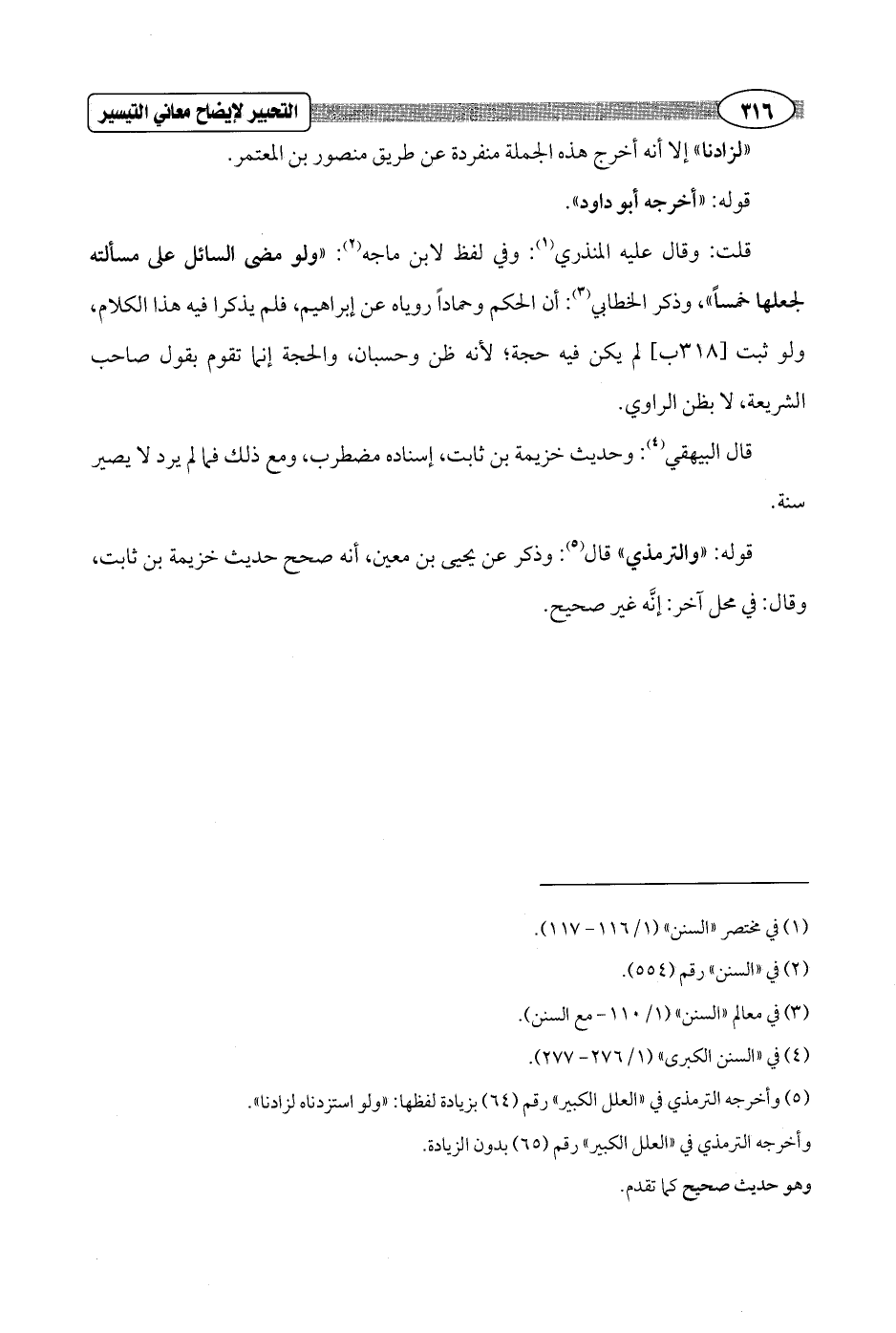 قلت: وقال عليه المنذري (¬1): وفي لفظ لابن ماجه (¬2): "ولو مضى السائل على مسألته لجعلها خمساً"، وذكر الخطابي (¬3): أن الحكم وحماداً روياه عن إبراهيم، فلم يذكرا فيه هذا الكلام، ولو ثبت [318 ب] لم يكن فيه حجة؛ لأنه ظن وحسبان، والحجة إنما تقوم بقول صاحب الشريعة، لا بظن الراوي.