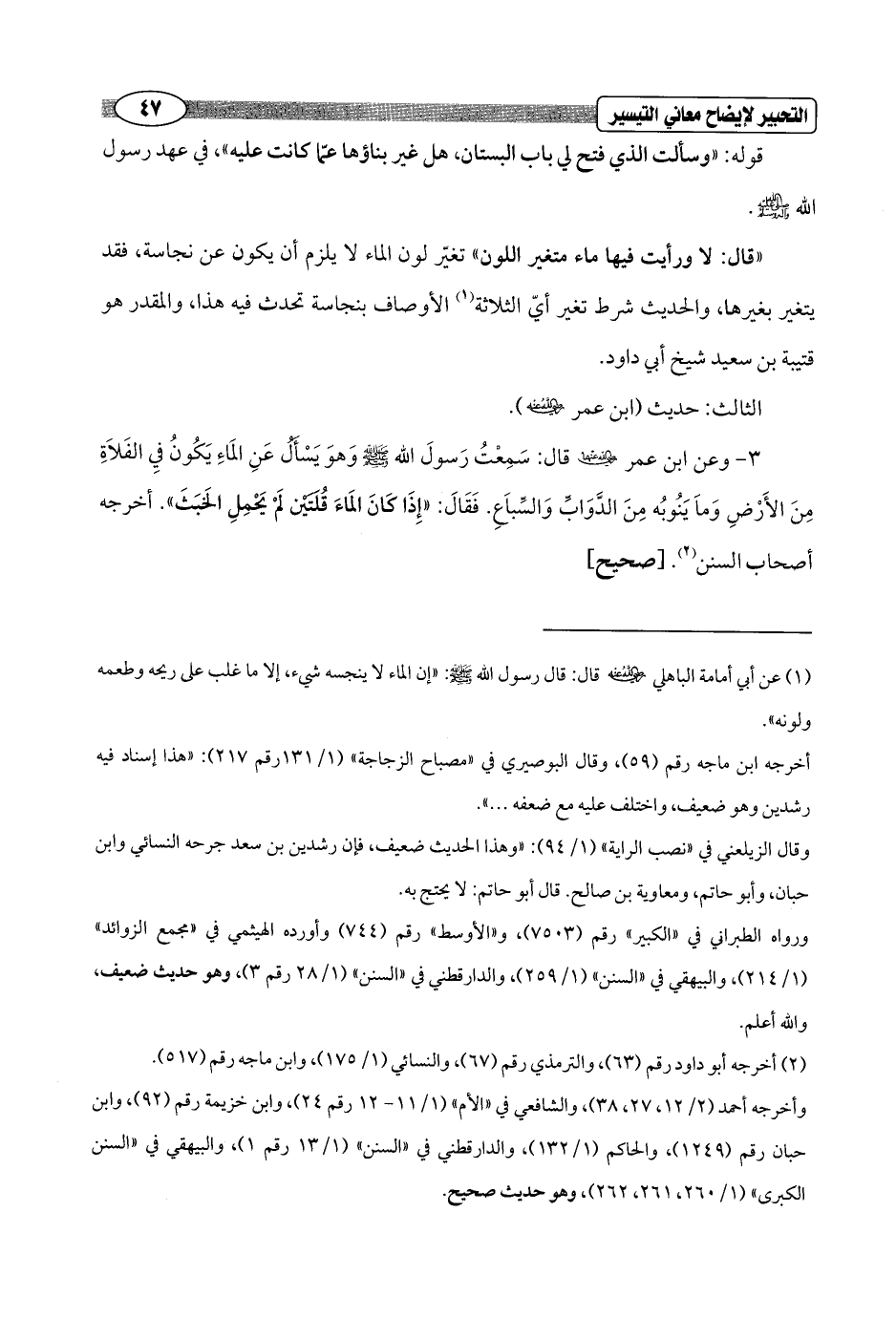 3 - وعن ابن عمر - رضي الله عنهما - قال: سَمِعْتُ رَسولَ الله - صلى الله عليه وسلم - وَهوَ يَسْأَلُ عَنِ المَاءِ يَكُونُ فِي الفَلاَةِ مِنَ الأَرْضِ وَماَ يَنُوبُه مِنَ الدَّوَابِّ وَالسِّباَعِ. فَقَالَ: "إِذَا كَانَ المَاءَ قُلَتَيْن لَمْ يَحْمِلِ الخَبَثَ". أخرجه أصحاب السنن (¬2). [صحيح]