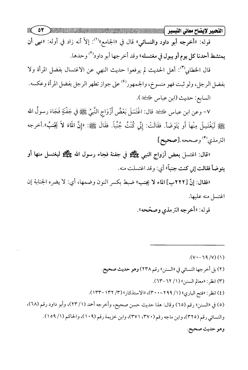 7 - وعن ابن عباس- رضي الله عنهما - قال: اغْتَسَلَ بَعْضُ أَزْوَاجِ النَّبيِّ - صلى الله عليه وسلم - في جَفْنَةٍ فَجَاءَ رسولُ الله - صلى الله عليه وسلم - ليَغْتَسِلَ مِنْهاَ أَو يَتَوَضَأ. فقَالَتْ: إِنِّي كُنْتُ جُنُباً. فقَالَ - صلى الله عليه وسلم -: "إِنَّ المَاءَ لاَ يَجْنبُ". أخرجه الترمذي (¬5) وصححه. [صحيح]