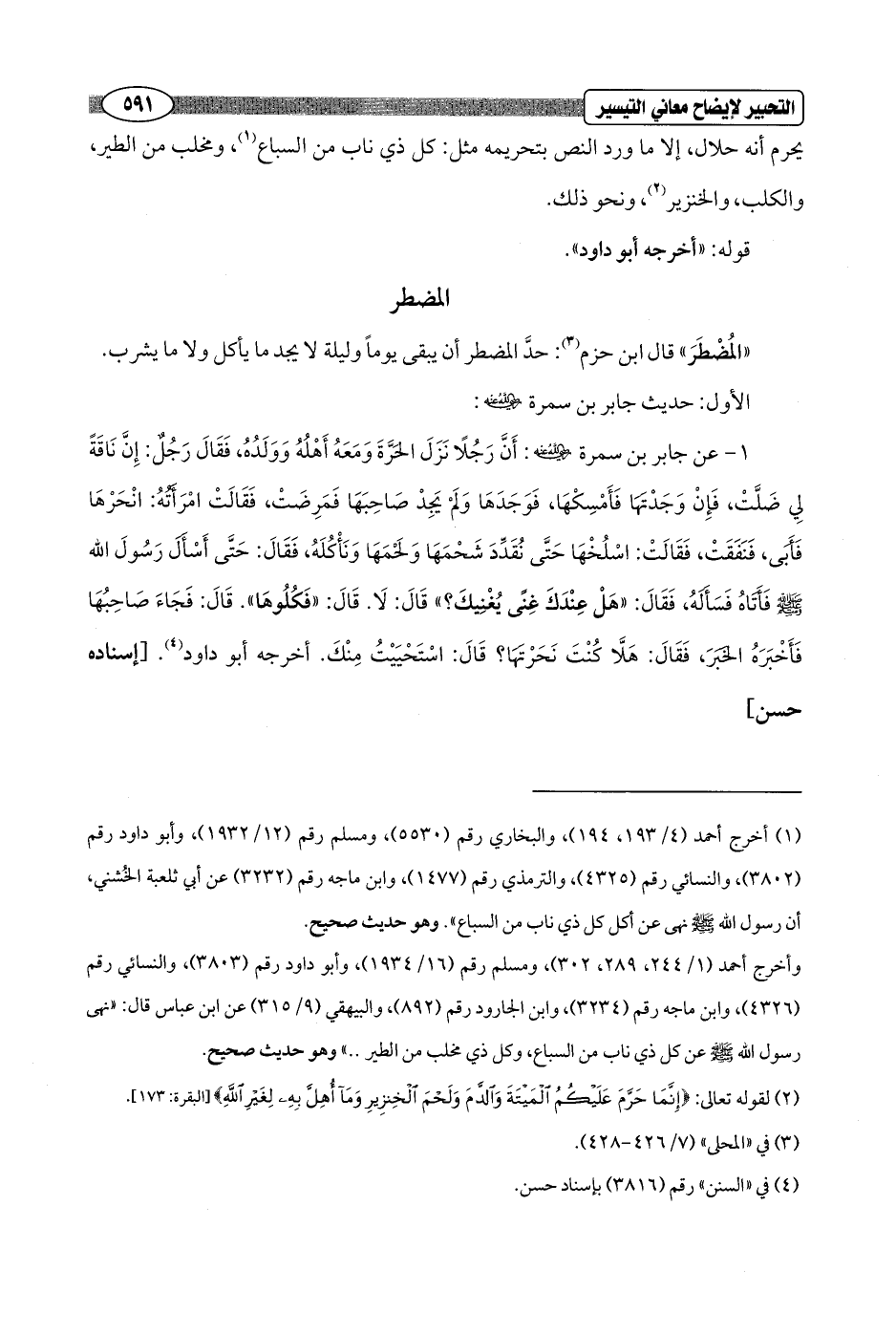 (¬1) أخرج أحمد (4/ 193، 194)، والبخاري رقم (5530)، ومسلم رقم (12/ 1932)، وأبو داود رقم (3802)، والنسائي رقم (4325)، والترمذي رقم (1477)، وابن ماجه رقم (3232) عن أبي ثلعبة الخُشني، أن رسول الله - صلى الله عليه وسلم - نهى عن كل كل ذي ناب من السباع". وهو حديث صحيح.
