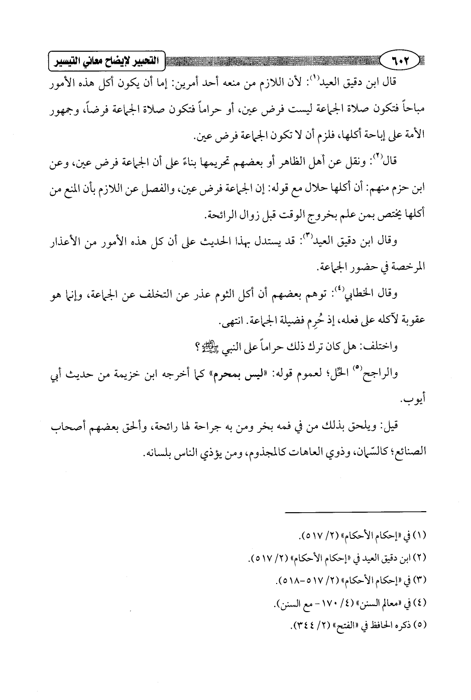 قال ابن دقيق العيد (¬1): لأن اللازم من منعه أحد أمرين: إما أن يكون أكل هذه الأمور مباحاً فتكون صلاة الجماعة ليست فرض عين، أو حراماً فتكون صلاة الجماعة فرضاً، وجمهور الأمة على إباحة أكلها، فلزم أن لا تكون الجماعة فرض عين.