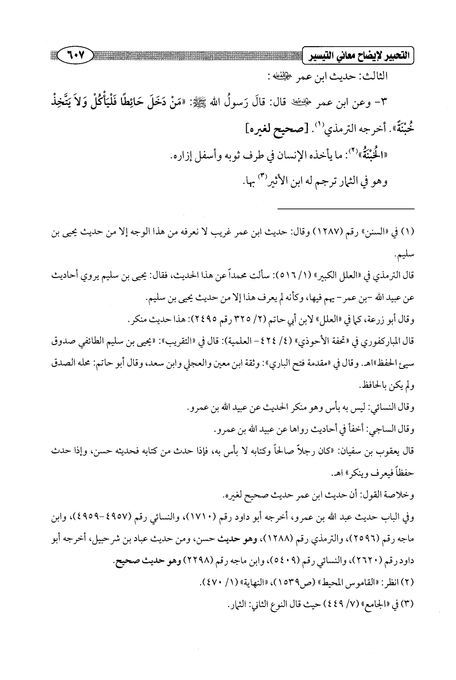 3 - وعن ابن عمر - رضي الله عنهما - قال: قَالَ رَسولُ الله - صلى الله عليه وسلم -: "مَنْ دَخَلَ حَائِطًا فَلْيَأْكُلْ وَلاَ يَتَّخِذْ خُبْنَةً". أخرجه الترمذي (¬1). [صحيح لغيره]