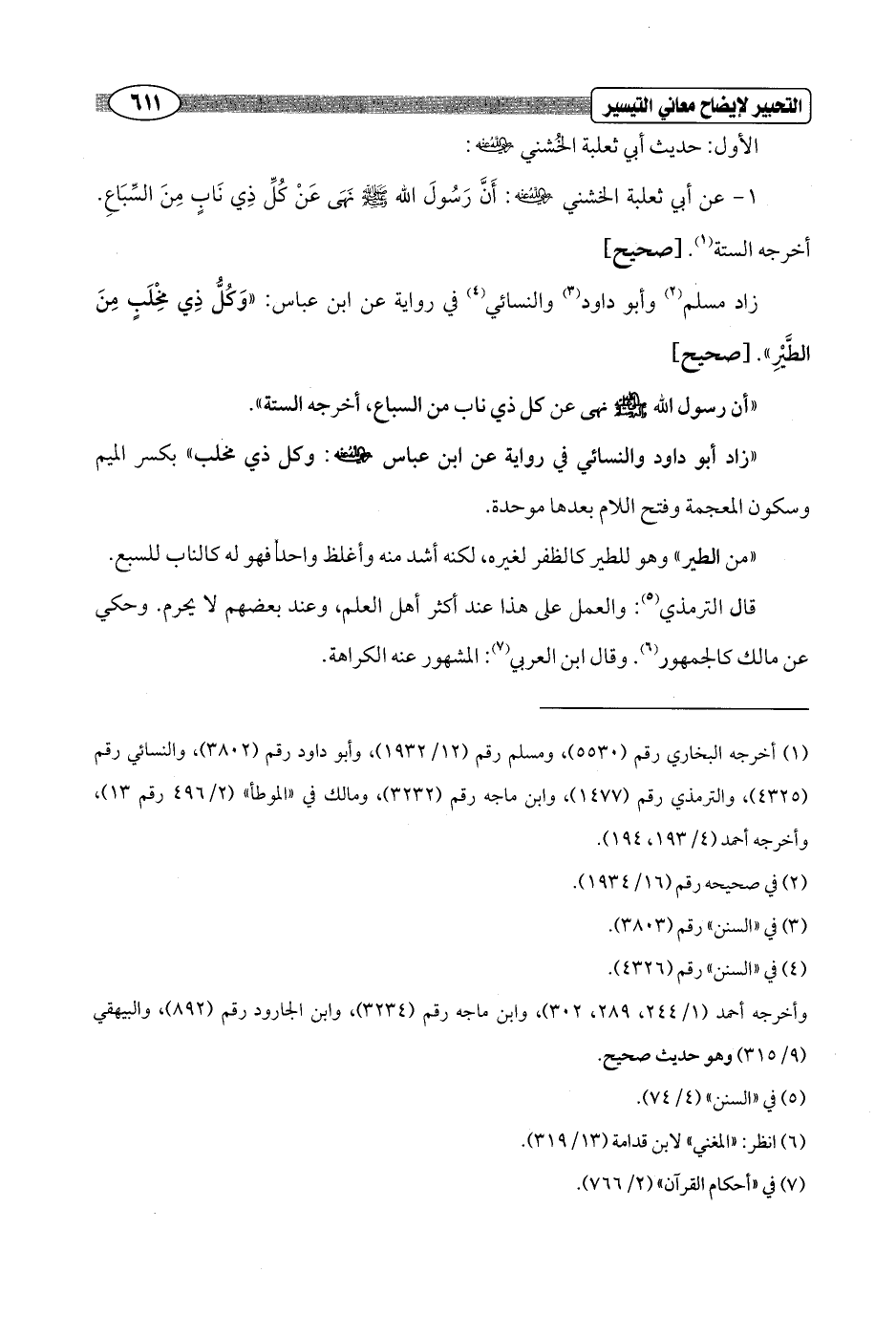 1 - عن أبي ثعلبة الخشني - رضي الله عنه -: أَنَّ رَسُولَ الله - صلى الله عليه وسلم - نَهَى عَنْ كُلِّ ذِي نَابٍ مِنَ السِّبَاعِ. أخرجه الستة (¬1). [صحيح]
