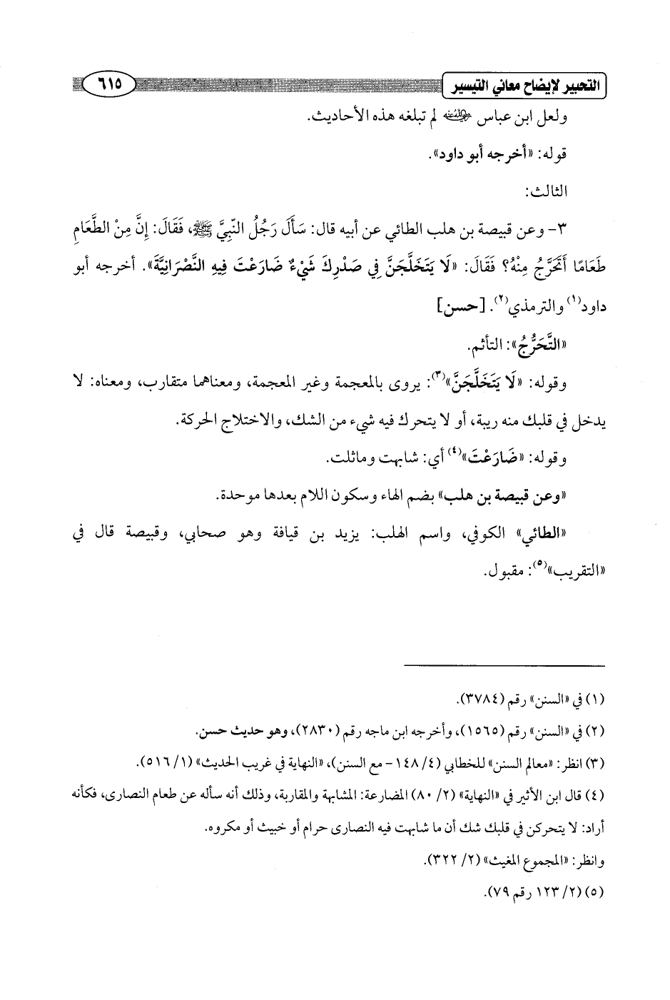 3 - وعن قبيصة بن هلب الطائي عن أبيه قال: سَأَلَ رَجُلُ النّبِيَّ - صلى الله عليه وسلم -، فَقَالَ: إِنَّ مِنْ الطَّعَامِ طَعَامًا أَتَحَرَّجُ مِنْهُ؟ فَقَالَ: "لَا يَتَخَلَّجَنَّ في صَدْرِكَ شَيْءٌ ضَارَعْتَ فِيهِ النَّصْرَانِيَّة". أخرجه أبو داود (¬1) والترمذي (¬2). [حسن]