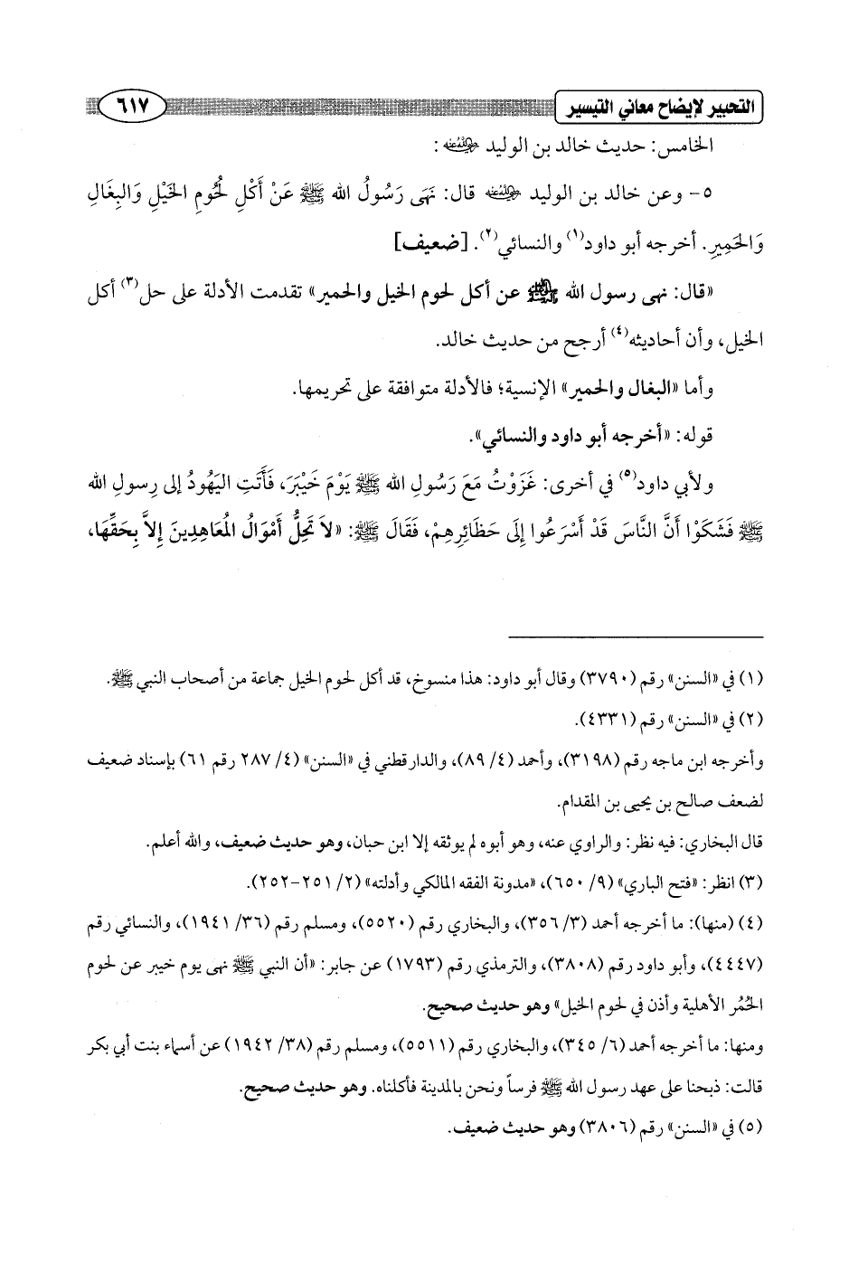 5 - وعن خالد بن الوليد - رضي الله عنه - قال: نَهَى رَسُولُ الله - صلى الله عليه وسلم - عنْ أَكْلِ لُحُومِ الخَيْلِ وَالبِغَالِ وَالحَمِيرِ. أخرجه أبو داود (¬1) والنسائي (¬2). [ضعيف]