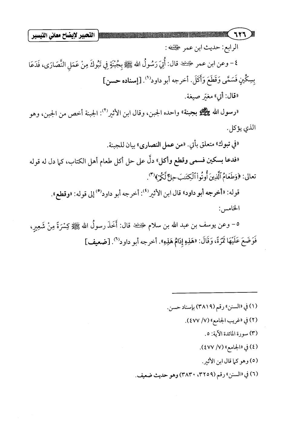 4 - وعن ابن عمر - رضي الله عنهما - قال: أُتِيَ رَسُولُ الله - صلى الله عليه وسلم - بِجُبْنَةٍ فِي تَبُوكَ مِنْ عَمَلِ النَّصَارَى، فَدَعَا بِسِكِّينٍ فَسَمَّى وَقَطَعَ وَأَكَلَ. أخرجه أبو داود (¬1). [إسناده حسن]