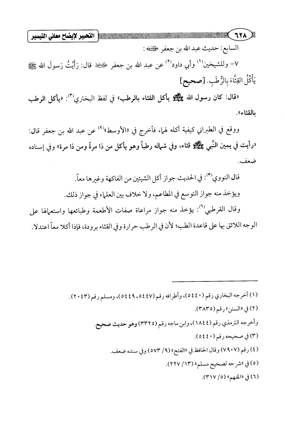 7 - وللشيخين (¬1) وأبي داود (¬2) عن عبد الله بن جعفر - رضي الله عنهما - قال: رَأَيْتُ رَسولَ الله - صلى الله عليه وسلم - يَأْكُلُ القِثَّاءَ بِالرُّطَبِ. [صحيح]