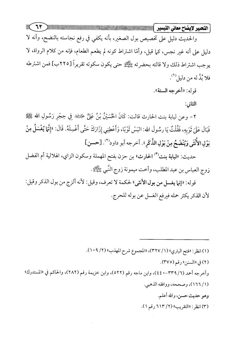 2 - وعن لبابة بنت الحارث قالت: كَانَ الحُسَيْنُ بْنُ عَلِيًّ - رضي الله عنهما - فِي حِجْرِ رَسُولِ الله - صلى الله عليه وسلم - فَبَالَ عَلَىَ ثَوَبِهِ، فَقُلْتُ يَا رسُولَ الله: البَسْ ثَوْبًا، وَأَعْطِنِي إِزَارَكَ حَتَّى أَغْسِلَهُ. قَالَ: "إِنَّمَا يُغْسَلُ مِنْ بَوْلِ الأُنْثَى وَيُنْضَحُ مِنْ بَوْلِ الذَّكَرِ". أخرجه أبو داود (¬2). [حسن]