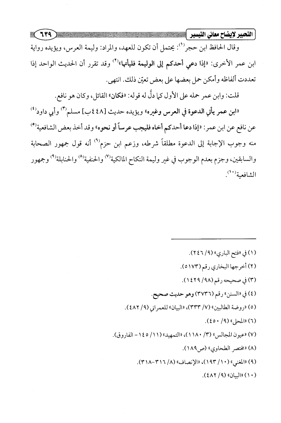 "ابن عمر يأتي الدعوة في العرس وغيره" ويؤيده حديث [448 ب] مسلم (¬3) وأبي داود (¬4) عن نافع عن ابن عمر: "إذا دعا أحدكم أخاه فليجب عرساً أو نحوه" وقد أخذ بعض الشافعية (¬5) منه وجوب الإجابة إلى الدعوة مطلقاً شرطه، وزعم ابن حزم (¬6) أنه قول جمهور الصحابة والسابقين، وجزم بعدم الوجوب في غير وليمة النكاح المالكية (¬7) والحنفية (¬8) والحنابلة (¬9) وجمهور الشافعية (¬10).