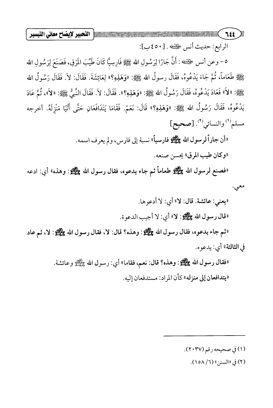 5 - وعن أنس - رضي الله عنه -: أَنَّ جَارًا لِرَسُولِ الله - صلى الله عليه وسلم - فَارِسِيًّا كَانَ طَيِّبَ الَمَرقِ، فَصَنَعَ لِرَسُولِ الله - صلى الله عليه وسلم - طَعَاماً، ثُمَّ جَاءَ يَدْعُوهُ، فَقَالَ رسولُ الله - صلى الله عليه وسلم -: "وَهَذِهِ؟ " لِعَائِشَةَ. فَقَالَ: لاَ. فَقَالَ رَسُولُ الله - صلى الله عليه وسلم - "لاَ" فَعَادَ يَدْعُوهُ، فَقَالَ رَسُولُ الله - صلى الله عليه وسلم -: "وَهَذِه؟ " فَقَالَ: لاَ. فَقَالَ النَّبيُّ - صلى الله عليه وسلم - "لاَ" ثُمَّ عَادَ يَدْعُوهُ، فَقَالَ رَسُولُ الله - صلى الله عليه وسلم -: "وَهَذِه؟ " قَالَ: نعم. فَقَامَا يَتَدَافَعَانِ حَتَّى أَتَيَا مَنْزِلَهُ. أخرجه مسلم (¬1) والنسائي (¬2). [صحيح]