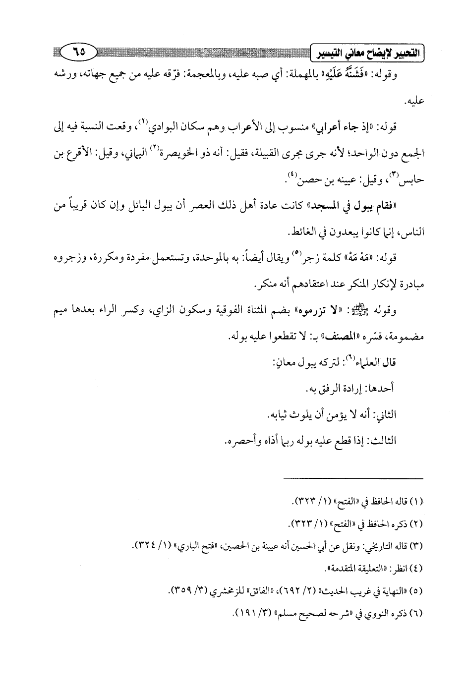 وقوله - صلى الله عليه وسلم - "لا تزرموه" بضم المثناة الفوقية وسكون الزاي، وكسر الراء بعدها ميم مضمومة، فسّره "المصنف" بـ: لا تقطعوا عليه بوله.