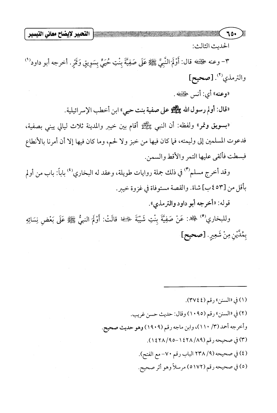 3 - وعنه - رضي الله عنه - قال: أَوْلَمَ النَّبِيَّ - صلى الله عليه وسلم - عَلَى صَفِيَّةَ بِنْتِ حُيَيٍّ بِسَوِيقٍ وَتَمْرٍ. أخرجه أبو داود (¬1) والترمذي (¬2). [صحيح]