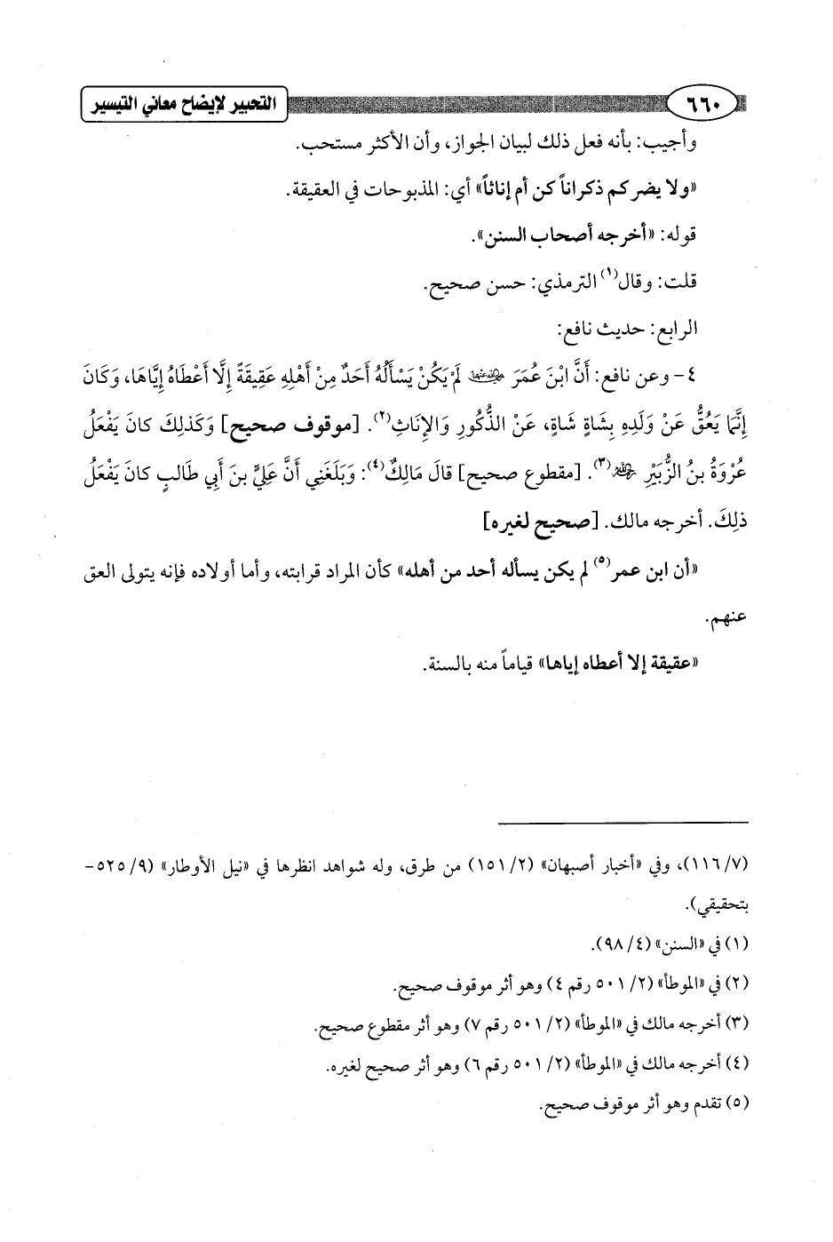 4 - وعن نافع: أَنَّ ابْنَ عُمَرَ - رضي الله عنهما - لَمْ يَكُنْ يَسْأَلُهُ أَحَدٌ مِنْ أَهْلِهِ عَقِيقَةً إِلَّا أَعْطَاهُ إِيَّاهَا، وَكَانَ إِنَّمَا يَعُقُّ عَنْ وَلدِهِ بِشَاةٍ شَاةٍ، عَنْ الذُّكُورِ وَالإِنَاثِ (¬2). [موقوف صحيح] وَكَذلِكَ كانَ يَفْعَلُ عُرْوَةُ بنُ الزُّبَيْرِ - رحمه الله - (¬3). [مقطوع صحيح] قَالَ مَالِكٌ (¬4): وَبَلَغَنِي أَنَّ عَليٍّ بنَ أَبِي طَالبٍ كانَ يَفْعَلُ ذلِكَ. أخرجه مالك. [صحيح لغيره]