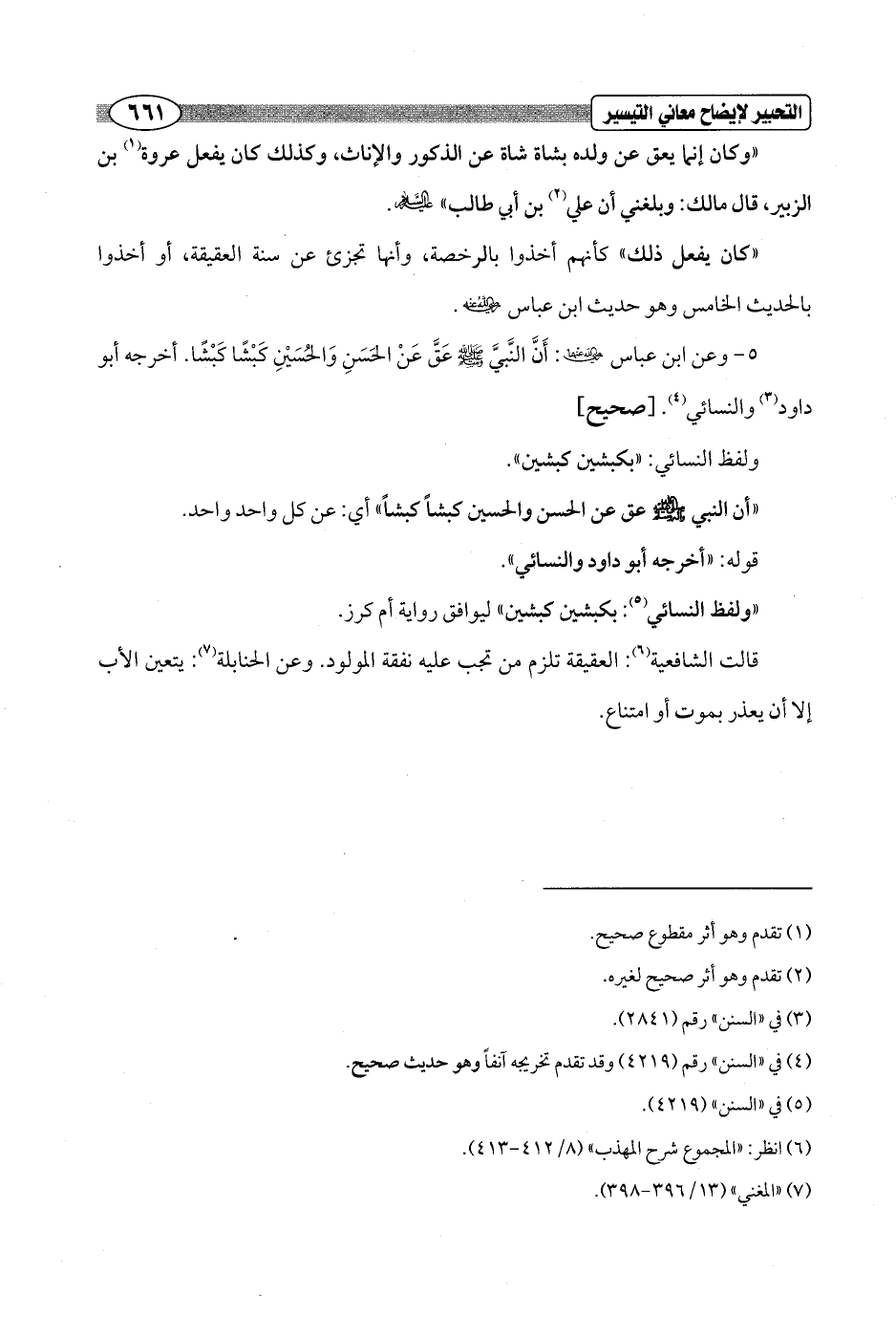 5 - وعن ابن عباس - رضي الله عنهما -: أَنَّ النَّبيَّ - صلى الله عليه وسلم - عقَّ عَنْ الحَسَنِ وَالحُسَيْنِ كَبْشًا كَبْشًا. أخرجه أبو داود (¬3) والنسائي (¬4). [صحيح]