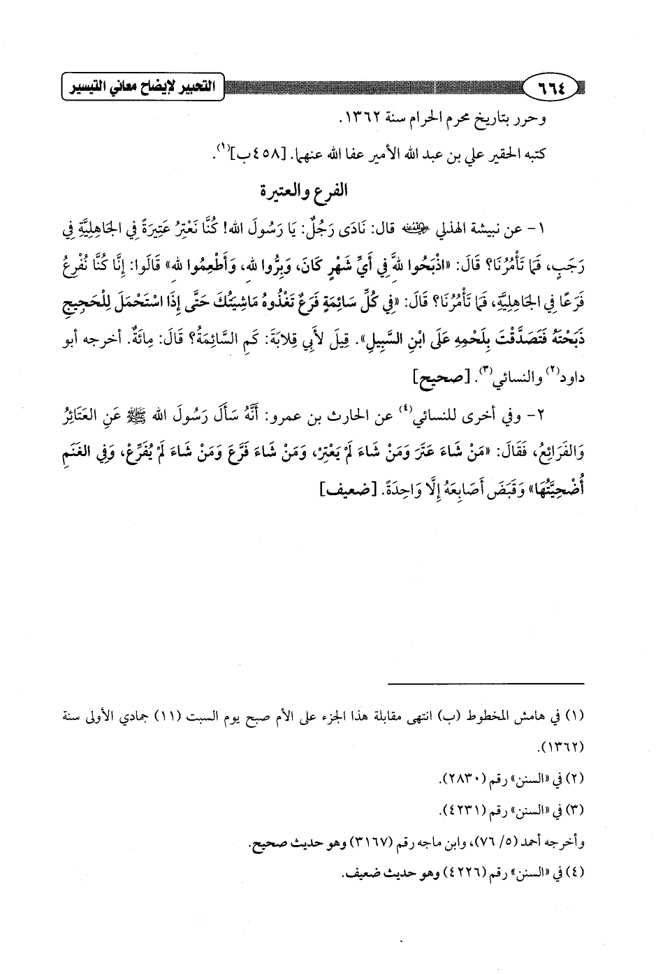 1 - عن نبيشة الهذلي - رضي الله عنه - قال: نَادَى رَجُلٌ: يَا رَسُولَ الله! كُنَّا نَعْتِرُ عَتِيرَةً فِي الجاهِلِيَّةِ فِي رَجَبٍ، فَمَا تَأْمُرُنَا؟ قَالَ: "اذْبَحُوا للهَّ في أَيِّ شَهْرٍ كَانَ، وَبِرُّوا للهِ، وَأَطْعِمُوا للهِ" قَالَوا: إِنَّا كُنَّا نُفْرِعُ فَرَعًا فِي الجَاهِلِيَّةِ، فَمَا تَأْمُرُنَا؟ قَالَ: "فِي كُلِّ سَائِمَةٍ فَرَعٌ تَغْذُوهُ مَاشِيَتُكَ حَتَّى إِذَا اسْتَحْمَلَ لِلْحَجِيجِ ذَبَحْتَهُ فَتَصَدَّقْتَ بِلَحْمِهِ عَلَى ابْنِ السَّبِيلِ". قِيلَ لأَبِي قِلابَةَ: كَمِ السَّائِمَةُ؟ قَالَ: مِائَةٌ. أخرجه أبو داود (¬2) والنسائي (¬3). [صحيح]