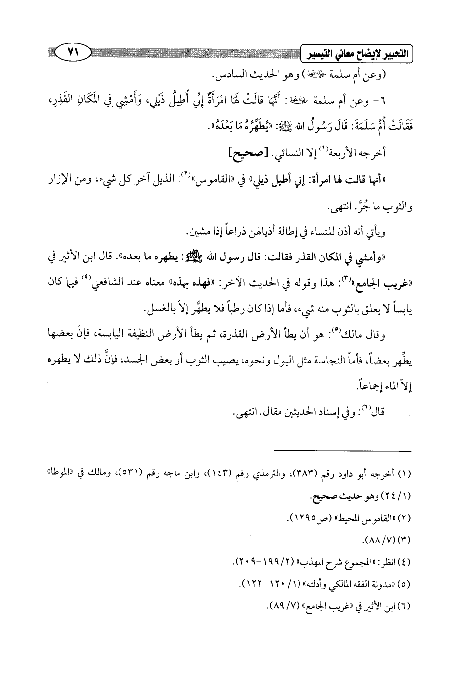 6 - وعن أم سلمة - رضي الله عنها -: أَنَّهَا قالَتْ لها امْرَأَةٌ إِنِّي أُطِيلُ ذَيْلِي، وَأَمْشِي فِي المَكَان القَذِرِ، فَقَالَتْ أُمُّ سَلَمَةَ: قَالَ رَسُولُ الله - صلى الله عليه وسلم -: "يُطَهِّرُهُ مَا بَعْدَهُ".