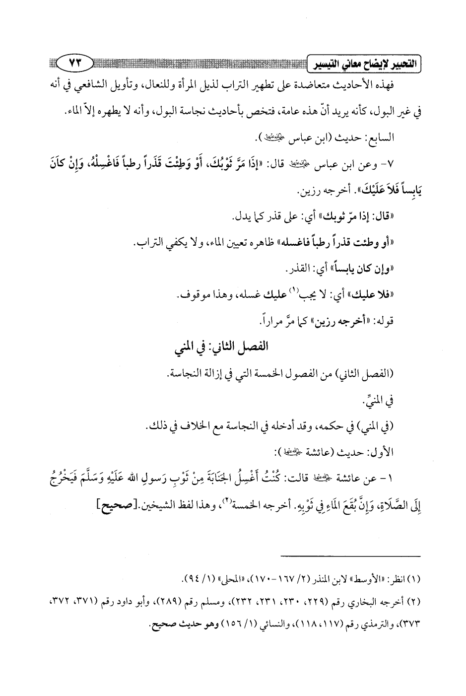 1 - عن عائشة - رضي الله عنها - قالت: كُنْتُ أَغْسِلُ الجَنَابَةَ مِنْ ثَوْبِ رَسولِ الله عَلَيْهِ وَسَلَّمَ فَيَخْرُجُ إِلَى الصَّلَاةِ, وَإِنَّ بُقَعَ المَاءِ فِي ثَوْبِهِ. أخرجه الخمسة (¬2)، وهذا لفظ الشيخين. [صحيح]
