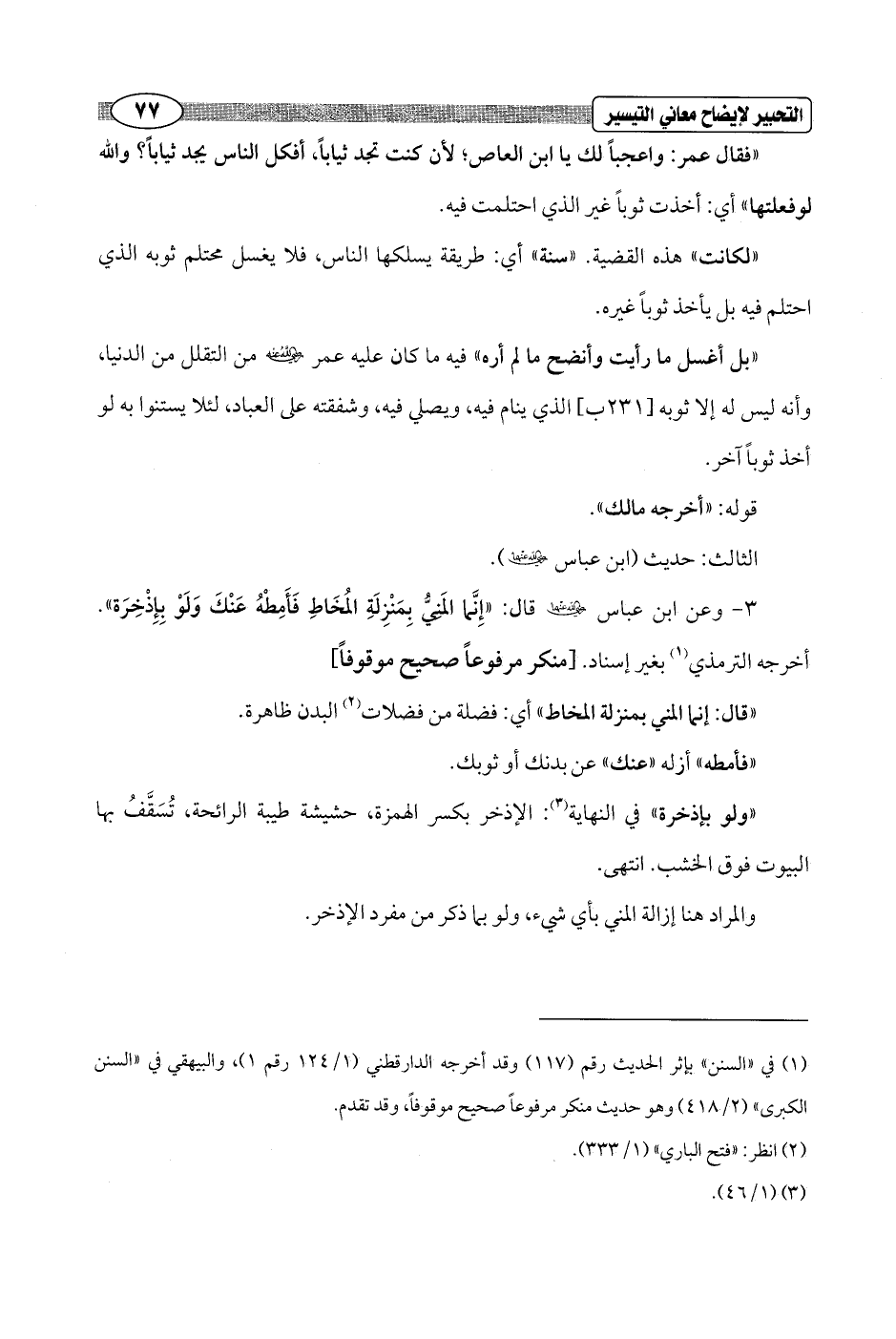 3 - وعن ابن عباس - رضي الله عنهما - قال: "إِنَّما المَنِيُّ بِمَنْزِلَةِ المُخَاطِ فَأَمِطْهُ عَنْكَ وَلَوْ بِإِذْخِرَة". أخرجه الترمذي (¬1) بغير إسناد. [منكر مرفوعاً صحيح موقوفاً]