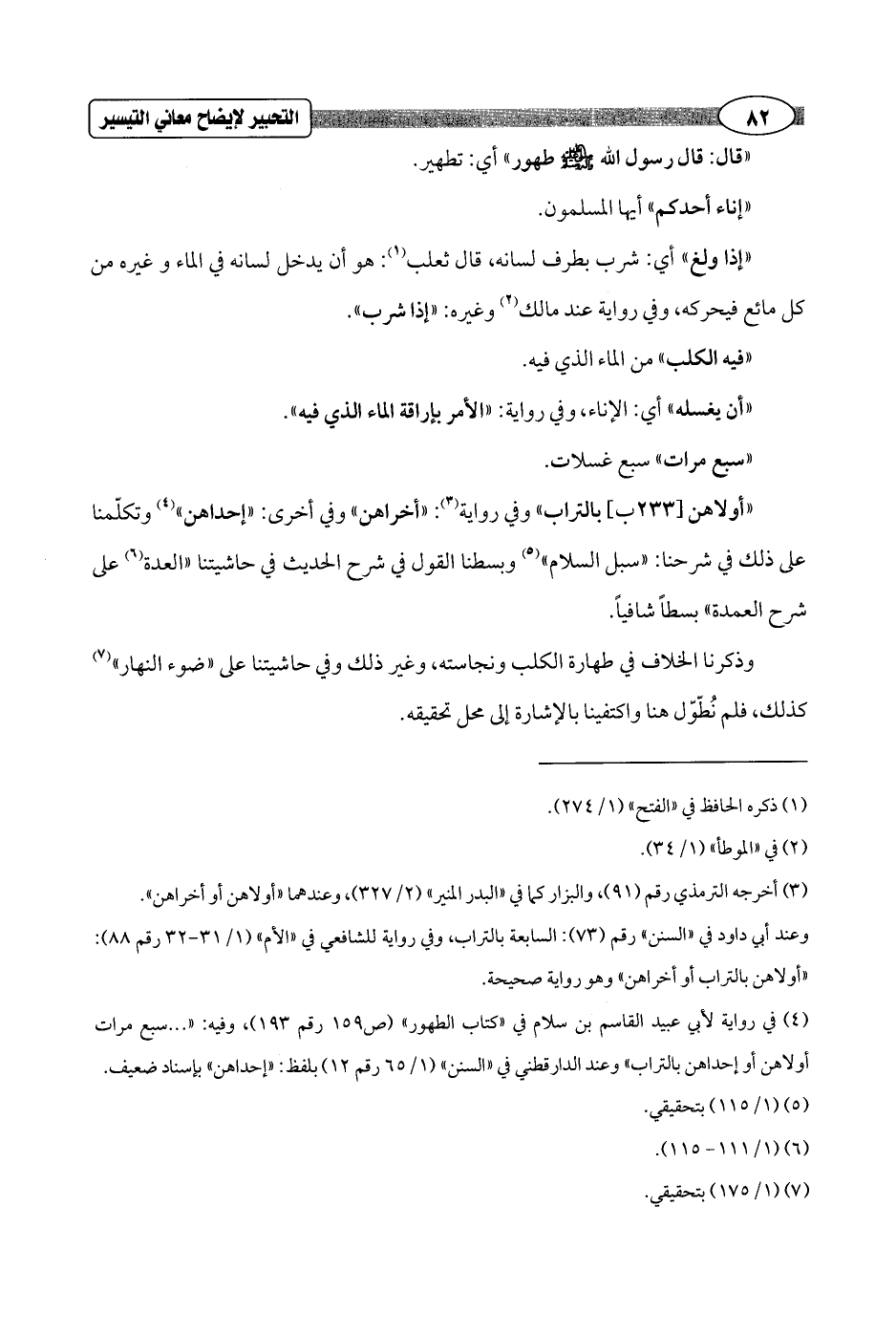 "أولاهن [233 ب] بالتراب" وفي رواية (¬3): "أخراهن" وفي أخرى: "إحداهن" (¬4) وتكلّمنا على ذلك في شرحنا: "سبل السلام" (¬5) وبسطنا القول في شرح الحديث في حاشيتنا "العدة (¬6) على شرح العمدة" بسطاً شافياً.