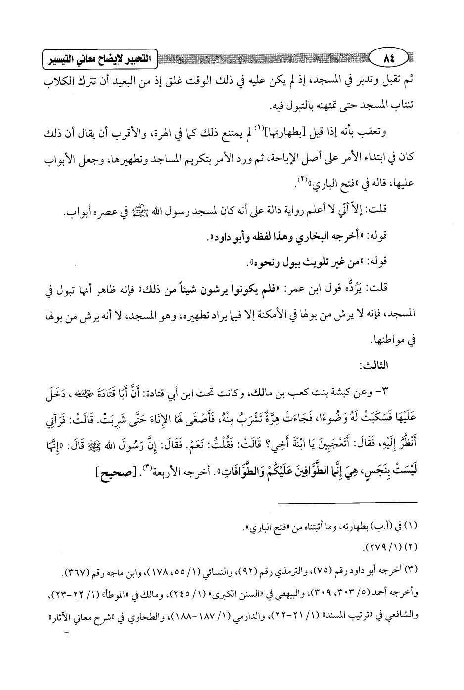 قلت: يَرُدُّه قول ابن عمر: "فلم يكونوا يرشون شيئاً من ذلك" فإنه ظاهر أنها تبول في المسجد، فإنه لا يرش من بولها في الأمكنة إلا فيما يراد تطهيره، وهو المسجد، لا أنه يرش من بولها في مواطنها.