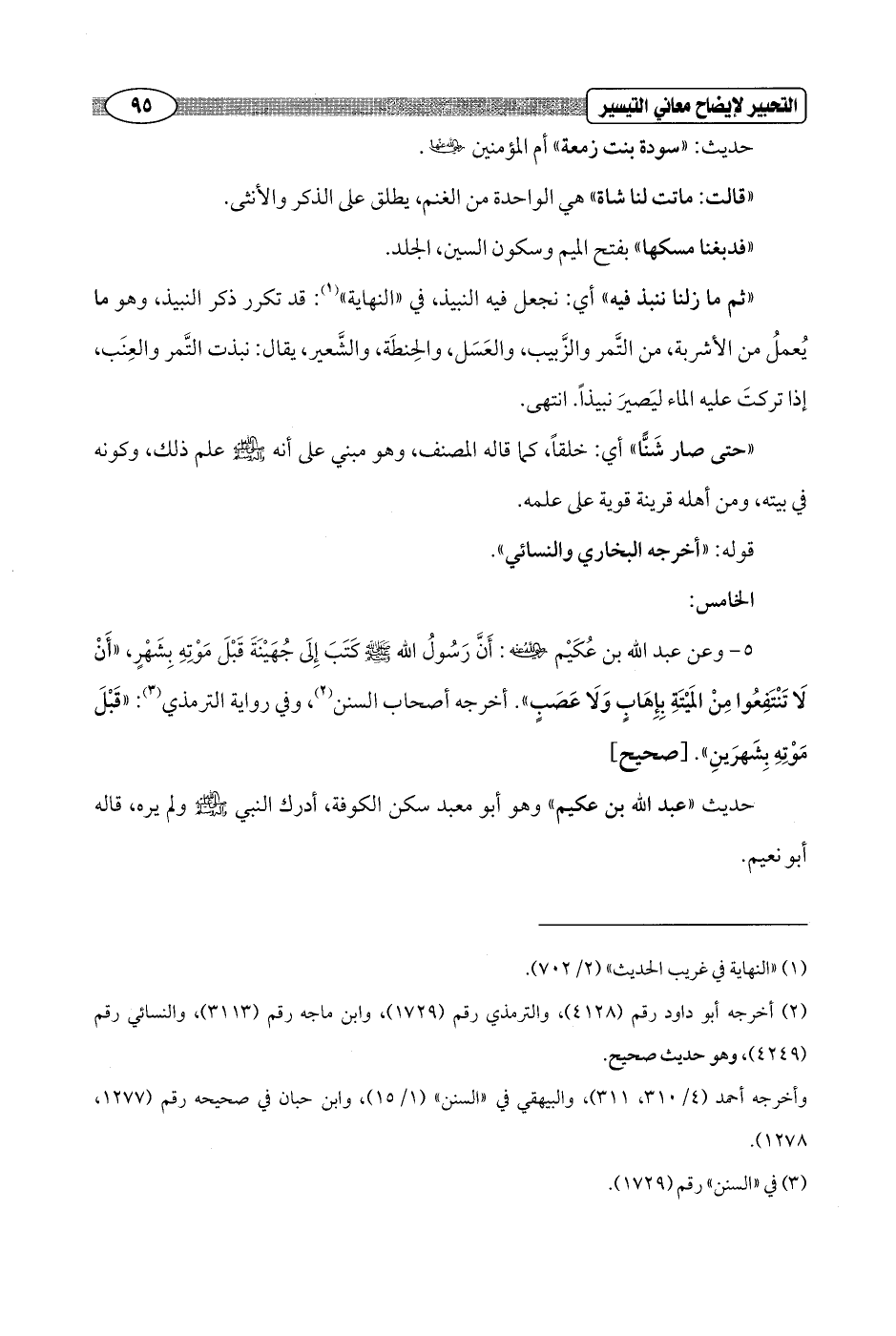 5 - وعن عبد الله بن عُكَيْم - رضي الله عنه -: أَنَّ رَسُولُ الله - صلى الله عليه وسلم - كتَبَ إِلَى جُهَيْنَةَ قَبْلَ مَوْتِهِ بِشَهْرٍ، "أَنْ لَا تَنْتَفِعُوا مِنْ المَيْتَةِ بِإِهَابٍ وَلَا عَصَبٍ". أخرجه أصحاب السنن (¬2)، وفي رواية الترمذي (¬3): "قَبْلَ مَوْتِهِ بِشَهرَينِ". [صحيح]