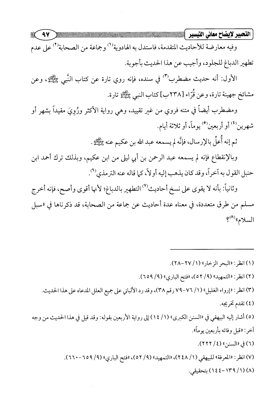 وثانياً: بأنه لا يقوى على نسخ أحاديث (¬7) التطهير بالدباغ؛ لأنها أقوى وأصح، فإنه أخرج مسلم من طرق متعددة، في معناه عدة أحاديث عن جماعة من الصحابة، قد ذكرناها في "سبل السلام" (¬8)؟