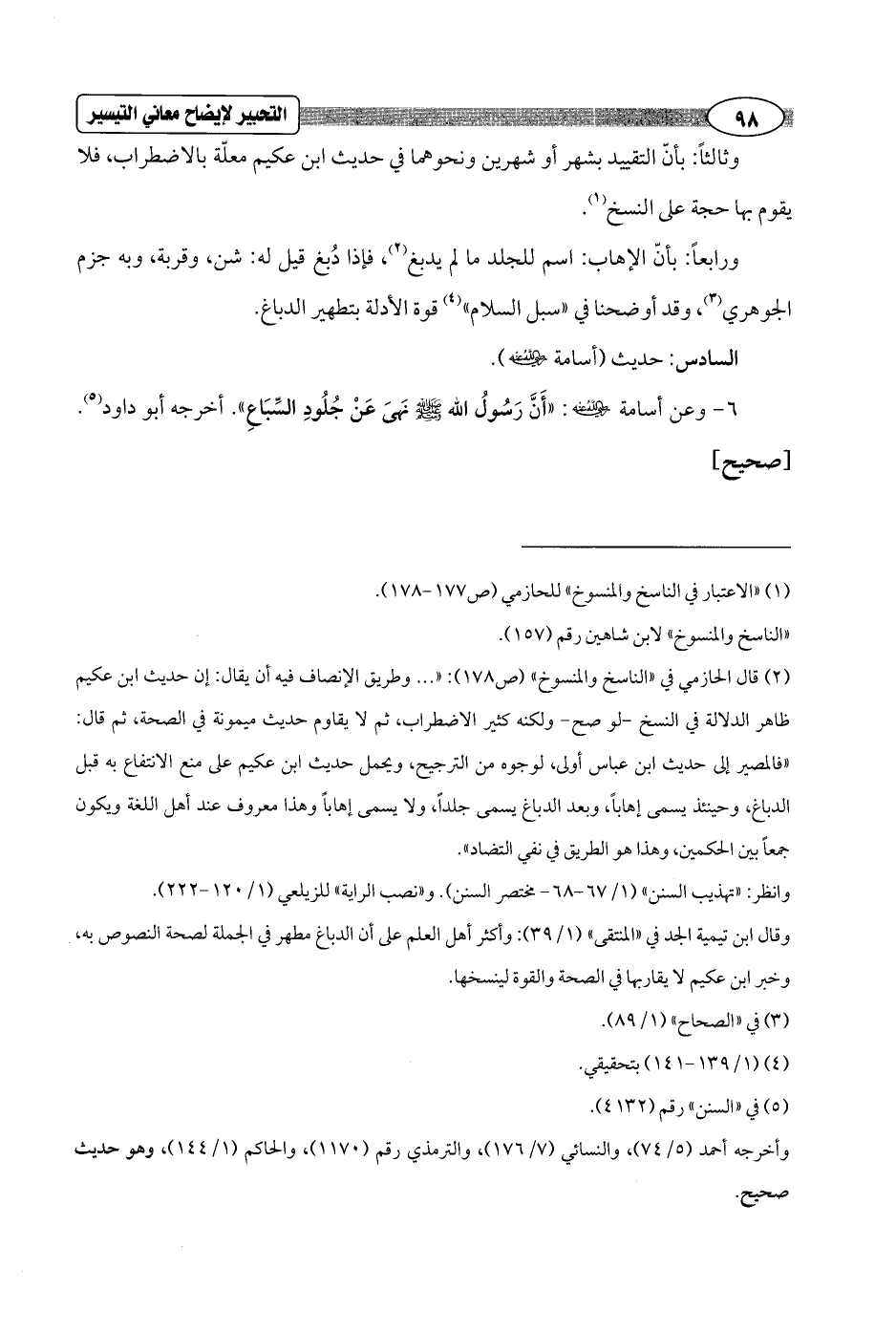 (¬2) قال الحازمي في "الناسخ والمنسوخ" (ص 178): " ... وطريق الإنصاف فيه أن يقال: إن حديث ابن عكيم ظاهر الدلالة في النسخ - لو صح - ولكنه كثير الاضطراب، ثم لا يقاوم حديث ميمونة في الصحة، ثم قال: "فالمصير إلى حديث ابن عباس أولى، لوجوه من الترجيح، ويحمل حديث ابن عكيم على منع الانتفاع به قبل الدباغ، وحينئذ يسمى إهاباً، وبعد الدباغ يسمى جلداً، ولا يسمى إهاباً وهذا معروف عند أهل اللغة ويكون جمعاً بين الحكمين، وهذا هو الطريق في نفي التضاد".