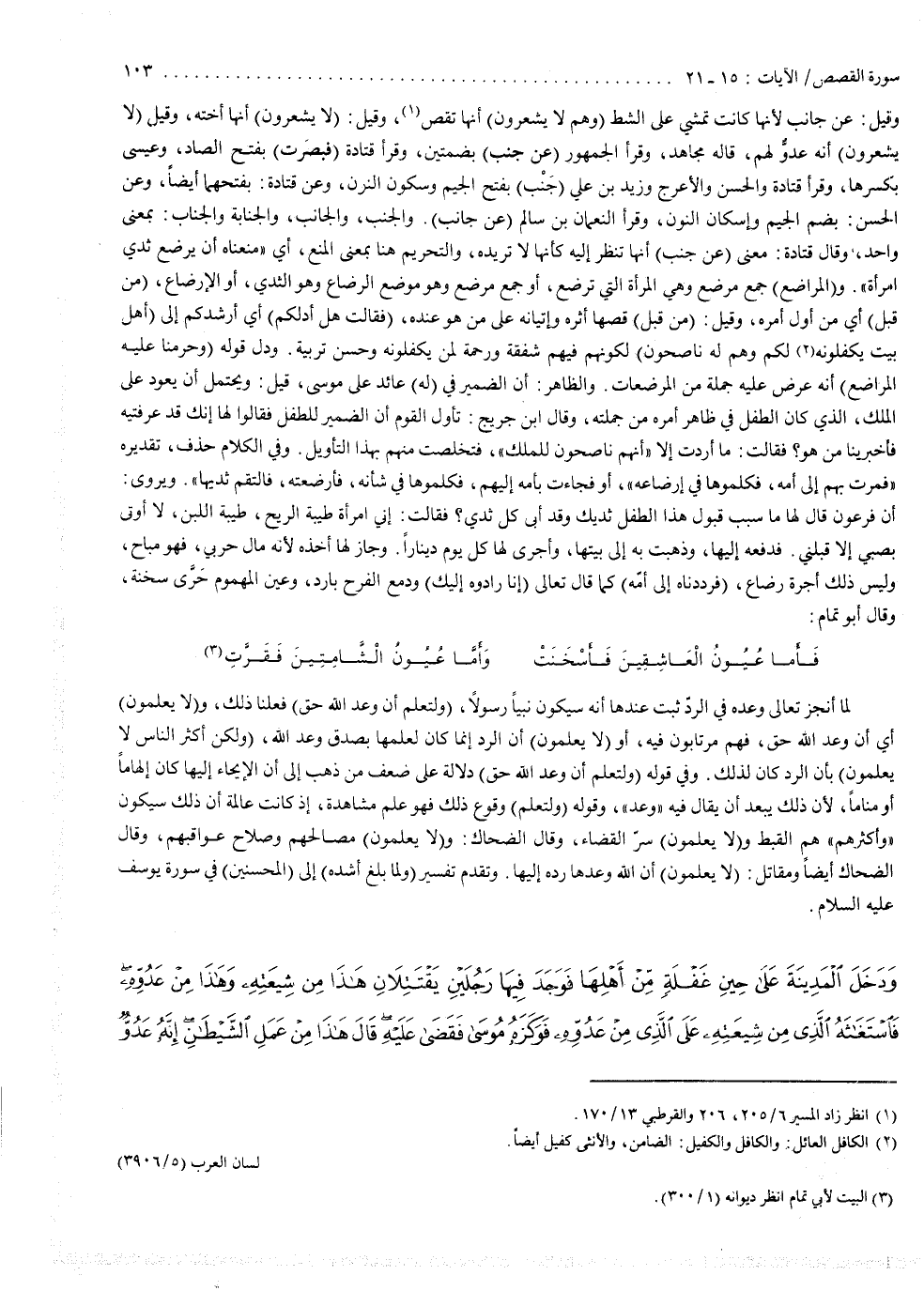 ( وَدَخَلَ الْمَدِينَةَ عَلَى حِينِ غَفْلَةٍ مّنْ أَهْلِهَا فَوَجَدَ فِيهَا رَجُلَيْنِ يَقْتَتِلاَنِ هَاذَا مِن شِيعَتِهِ وَهَاذَا مِنْ عَدُوّهِ فَاسْتَغَاثَهُ الَّذِى ). ( سقط : من شيعته على الذي من عدوه فوكزه موسى فقضى عليه قال هذا من عمل الشيطان إنه عدو )