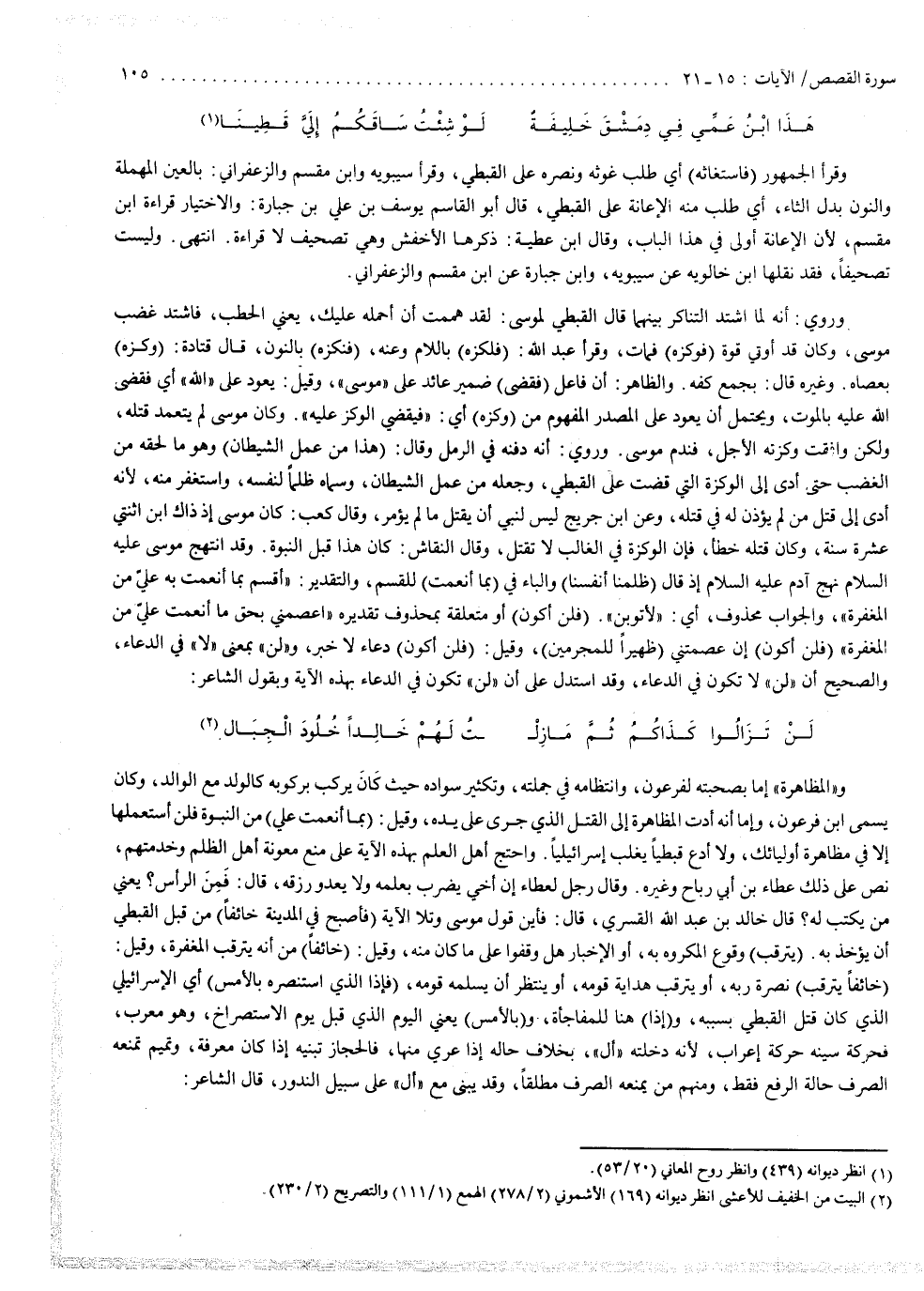 وقرأ الجمهور : ) فاستغاثة ( ، أي طلب غوثه ونصره على القبطي . وقرأ سيبويه ، وابن مقسم ، والزعفراني : بالعين المهملة والنون بدل الثاء ، أي طلب منه الإعانة على القبطي . قال أبو القاسم يوسف بن علي بن جبارة : والاختيار قراءة ابن مقسم ، لأن الإعانة أولى في هذا الباب . وقال ابن عطية : ذكرها الأخفش ، وهي تصحيف لا قراءة . انتهى . وليست تصحيفاً ، فقد نقلها ابن خالويه عن سيبويه ، وابن جبارة عن ابن مقسم والزعفراني . وروي أنه لما اشتد التناكر بينهما قال القبطي لموسى : لقد هممت أن أحمله عليك ، يعني الحطب ، فاشتد غضب موسى ، وكان قد أوتي قوة ، ( عَدُوّهِ فَوَكَزَهُ ( ، فمات . وقرأ عبد الله فلكزه ، باللام ، وعنه : فنكزه ، بالنون . قال قتادة : وكزه بعصاه ؛ وغيره قال : بجمع كفه ، والظاهر أن فاعل ) فَقَضَى ( ضمير عائد على موسى . وقيل : يعود على الله ، أي فقضى الله عليه بالموت . ويحتمل أن يعود على المصدر المفهوم من وكزه ، أي فقضى الوكز عليه ، وكان موسى لم يتعمد قتله ، ولكن وافقت وكزته الأجل ، فندم موسى . وروي أنه دفنه في الرمل وقال : ) هَاذَا مِنْ عَمَلِ الشَّيْطَانِ ( ، وهو ما لحقه من الغضب حتى أدى إلى الوكزة التي قضت على القبطي ، وجعله من عمل الشيطان وسماه ظلماً لنفسه واستغفر منه ، لأنه أدى إلى قتل من لم يؤذن له في قتله . وعن ابن جريج : ليس لنبي أن يقتل ما لم يؤمر . وقال كعب : كان موسى إذ ذاك ابن اثنتي عشرة سنة ، وكان قتله خطأ ، فإن الوكزة في الغالب لا تقتل . وقال النقاش : كان هذا قبل النبوة ، وقد انتهج موسى عليه السلام نهج آدم عليه السلام إذ قال : ) ظَلَمْنَا أَنفُسَنَا ). والباء في ) بِمَا أَنْعَمْتَ ( للقسم ، والتقدير : أقسم بما أنعمت به عليّ من المغفرة ، والجواب محذوف ، أي لأتوبن ، ( فَلَنْ أَكُونَ ( ، أو متعلقة بمحذوف تقديره : اعصمني بحق ما أنعمت عليّ من المغفرة ، ( فَلَنْ أَكُونَ ( إن عصمتني ) ظَهِيراً لّلْمُجْرِمِينَ ). وقيل : ) فَلَنْ أَكُونَ ( دعاء لا خبر ، ولن بمعنى لا في الدعاء ، والصحيح أن لن لا تكون في الدعاء ، وقد استدل على أن لن تكون في الدعاء بهذه الآية ، وبقول الشاعر :