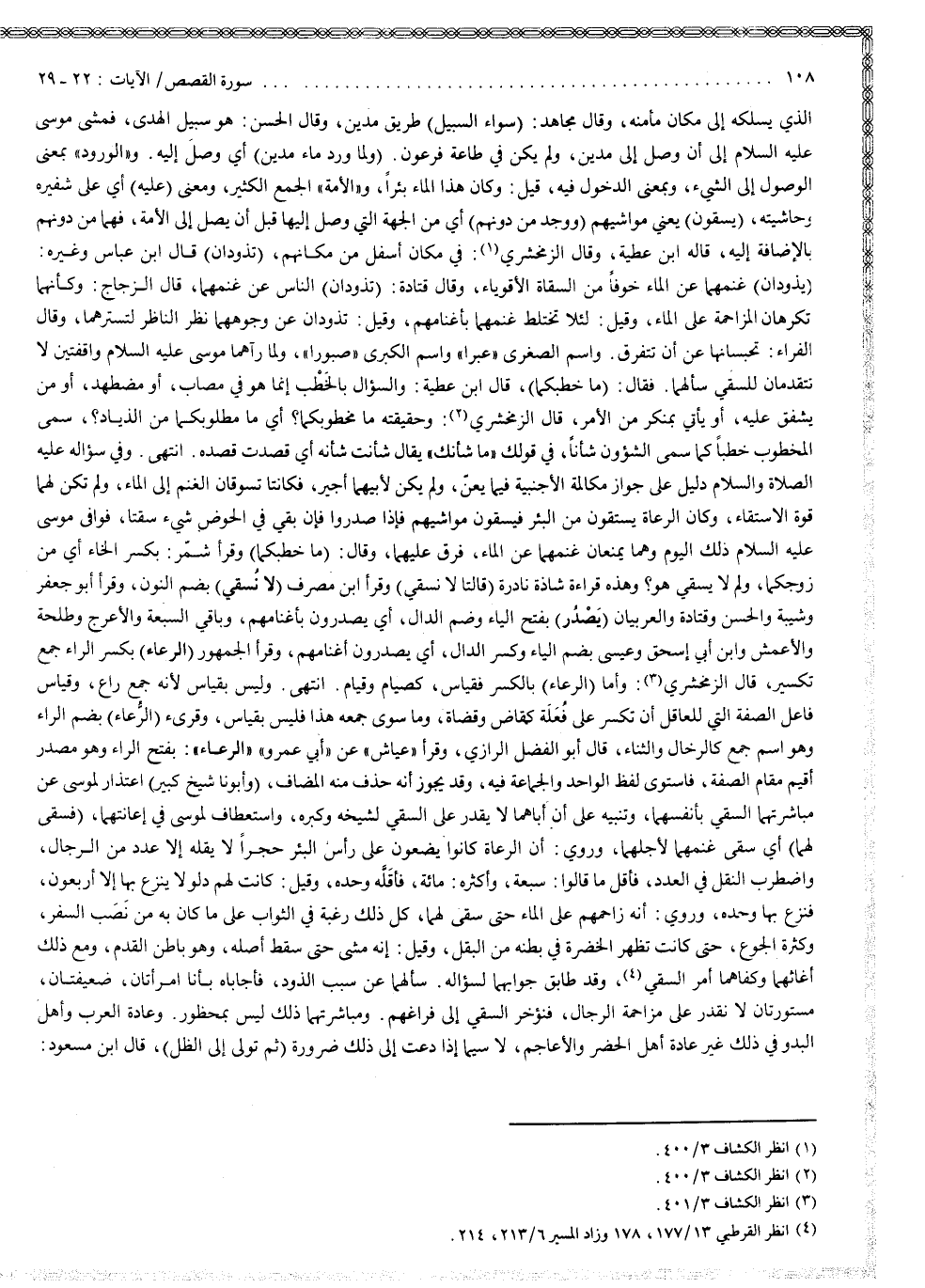 ( وَلَمَّا وَرَدَ مَاء مَدْيَنَ ( : أي وصل إليه ، والورود بمعنى الوصول إلى الشيء ، وبمعنى الدخول فيه . قيل : وكان هذا الماء بئراً . والأمة : الجمع الكثير ، ومعنى عليه : أي على شفيره وحاشيته . ) يُسْقَوْنَ ( : يعني مواشيهم . ) وَوَجَدَ مِن دُونِهِمُ ( : أي من الجهة التي وصل إليها قبل أن يصل إلى الأمة ، فهما من دونهم بالإضافة إليه ، قاله ابن عطية . وقال الزمخشري : في مكان أسفل من مكانهم . ) تَذُودَانِ ( ، قال ابن عباس وغيره : تذودان غنمهما عن الماء خوفاً من السقاة الأقوياء . وقال قتادة : تذودان الناس عن غنمهما . قال الزجاج : وكأنهما تكرهان المزاحمة على الماء . وقيل : لئلا تختلط غنمهما بأغنامهم . وقيل : تذودان عن وجوههما نظر الناظر لتسترهما . وقال الفراء : تحبسانها عن أن تتفرق ، واسم الصغرى عبرا ، واسم الكبر صبورا .