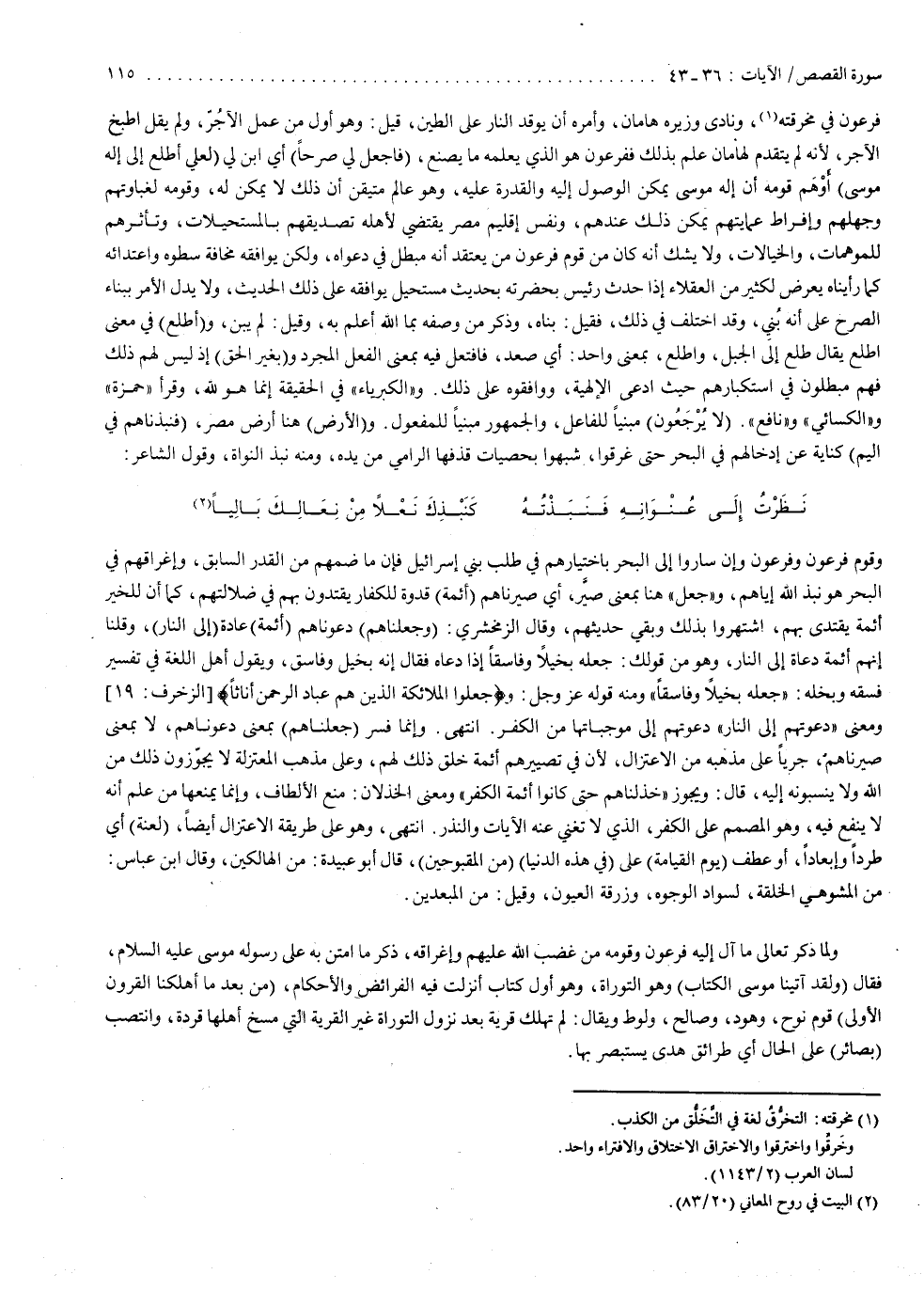 ( فَاجْعَل لّى صَرْحاً ( : أي ابن لي ، لعل أطلع إلى إله موسى . أوهم قومه أن إله موسى يمكن الوصول إليه والقدرة عليه ، وهو عالم متيقن أن ذلك لا يمكن له ؛ وقومه لغباوتهم وجهلهم وإفراط عمايتهم ، يمكن ذلك عندهم ، ونفس إقليم مصر يقتضي لأهله تصديقهم بالمستحيلات وتأثرهم للموهمات والخيالات ، ولا يشك أنه كان من قوم فرعون من يعتقد أنه مبطل في دعواه ، ولكن يوافقه مخافه سطوه واعتدائه . كما رأيناه يعرض لكثير من العقلاء ، إذا حدث رئيس بحضرته بحديث مستحيل ، يوافقه على ذلك الحديث . ولا يدل الأمر ببناء الصرح على أنه بني ، وقد اختلف في ذلك ، فقيل : بناه ، وذكر من وصفه بما الله أعلم به . وقيل : لم يبن . واطلع في معنى : اطلع ، يقال : طلع إلى الجبل واطلع بمعنى واحد ، أي صعد ، فافتعل فيه بمعنى الفعل المجرد وبغير الحق ، إذ ليس لهم ذلك ، فهم مبطلون في استكبارهم ، حيث ادعى الإلهية ووافقوه على ذلك ؛ والكبرياء في الحقيقة إنما هو الله . وقرأ حمزة ، والكسائي ، ونافع : لا يرجون ، مبنياً للفاعل ؛ والجمهور : مبنياً للمفعول . والأرض هنا أرض مصر . ) فَنَبَذْنَاهُمْ فِى الْيَمّ ( : كناية عن إدخالهم في البحر حتى غرقوا ، شبهوا بحصيات . قذفها الرامي من يده ، ومنه نبذ النواة ، وقول الشاعر : نظرت إلى عنوانه فنبذته