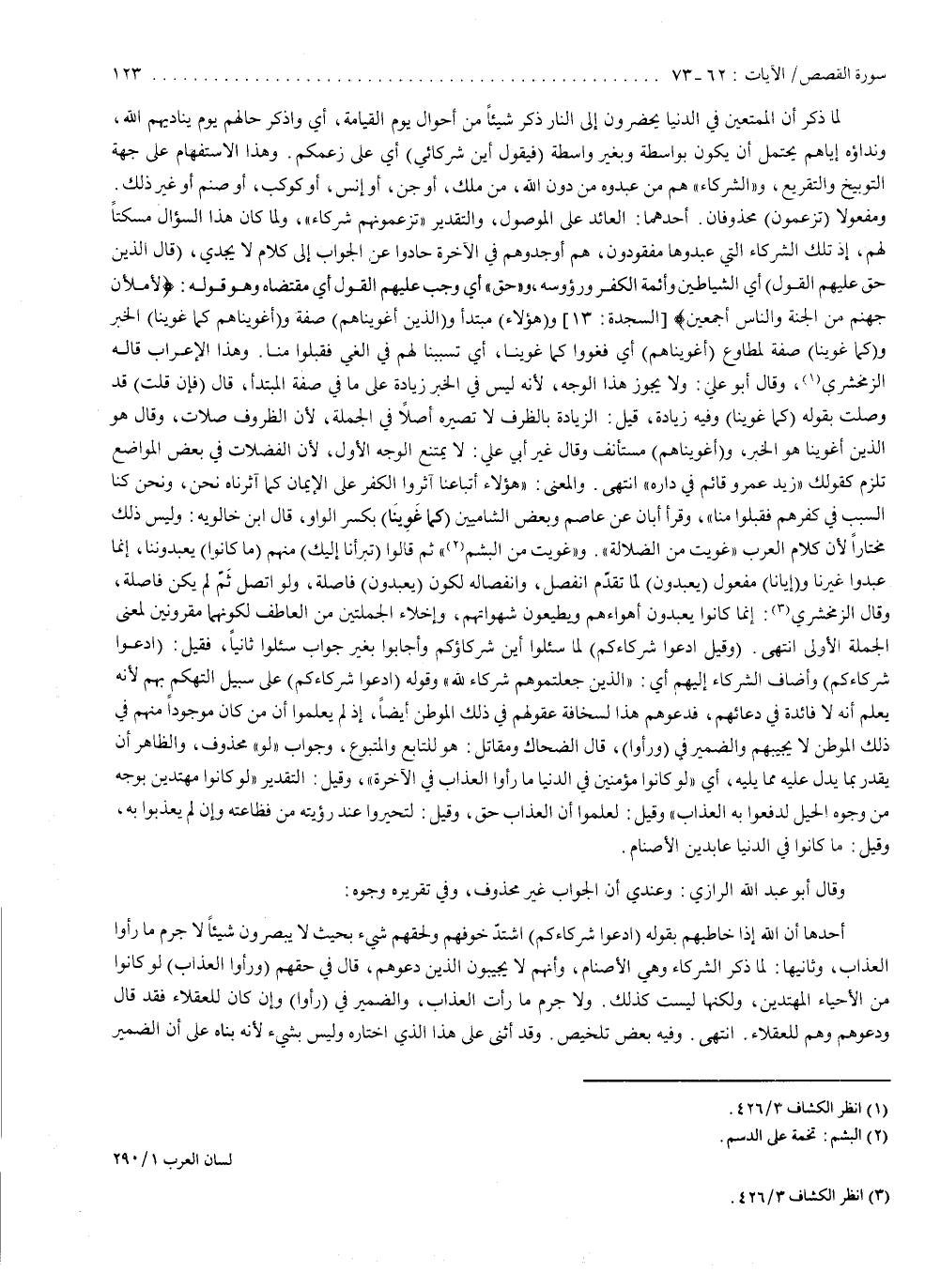 ( قَالَ الَّذِينَ حَقَّ عَلَيْهِمُ الْقَوْلُ ( : أي الشياطين ، وأئمة الكفر ورؤوسه ؛ وحق : أي وجب عليهم القول ، أي مقتضاه ، وهو قوله : ) لاَمْلاَنَّ جَهَنَّمَ مِنَ الْجِنَّةِ وَالنَّاسِ أَجْمَعِينَ ). و ) هَؤُلاء ( : مبتدأ ، و ) الَّذِينَ أَغْوَيْنَا ( : هم صفة ، و ) أَغْوَيْنَاهُمْ كَمَا غَوَيْنَا ( : الخبر ، و ) كَمَا غَوَيْنَا ( : صفة لمطاوع أغويناهم ، أي فغووا كما غوينا ، أي تسببنا لهم في الغي فقبلوا منا . وهذا الإعراب قاله الزمخشري . وقال أبو عليّ : ولا يجوز هذا الوجه ، لأنه ليس في الخبر زيادة على ما في صفة المبتدأ . قال : فإن قلت : قد وصلت بقوله : ) كَمَا غَوَيْنَا ( ، وفيه زيادة . قيل : الزيادة بالظرف لا تصيره أصلاً في الجملة ، لأن الظروف صلات ، وقال هو : ) الَّذِينَ أَغْوَيْنَا ( هو الخبر ، و ) أَغْوَيْنَاهُمْ ( : مستأنف . وقال غير أبي علي : لا يمتنع الوجه الأول ، لأن الفضلات في بعض المواضع تلزم ، كقولك : زيد عمرو قائم في داره . انتهى . والمعنى : هؤلاء أتباعنا آثروا الكفر على الإيمان ، كما آثرناه نحن ، ونحن كنا السبب في كفرهم ، فقبلوا منا . وقرأ أبان ، عن عاصم وبعض الشاميين : كما غوينا ، بكسر الواو . قال ابن خالويه : وليس ذلك مختاراً ، لأن كلام العرب : غويت من الضلالة ، وغويت من البشم . ثم قالوا : ) تَبَرَّأْنَا إِلَيْكَ ( ، منهم ما كانوا يعبدوننا ، إنما عبدوا غيرنا ، و ) إِيَّانَا ( : مفعول ) يَعْبُدُونَ ( ، لما تقدّم الفصل ، وانفصاله لكون يعبدون فاصلة ، ولو اتصل ، ثم لم يكن فاصلة . وقال الزمخشري : إنما كانوا يعبدون أهواءهم ويطيعون شهواتهم ؛ وإخلاء الجملتين من العاطف ، لكونهما مقرونين لمعنى الجملة الأولى . انتهى .