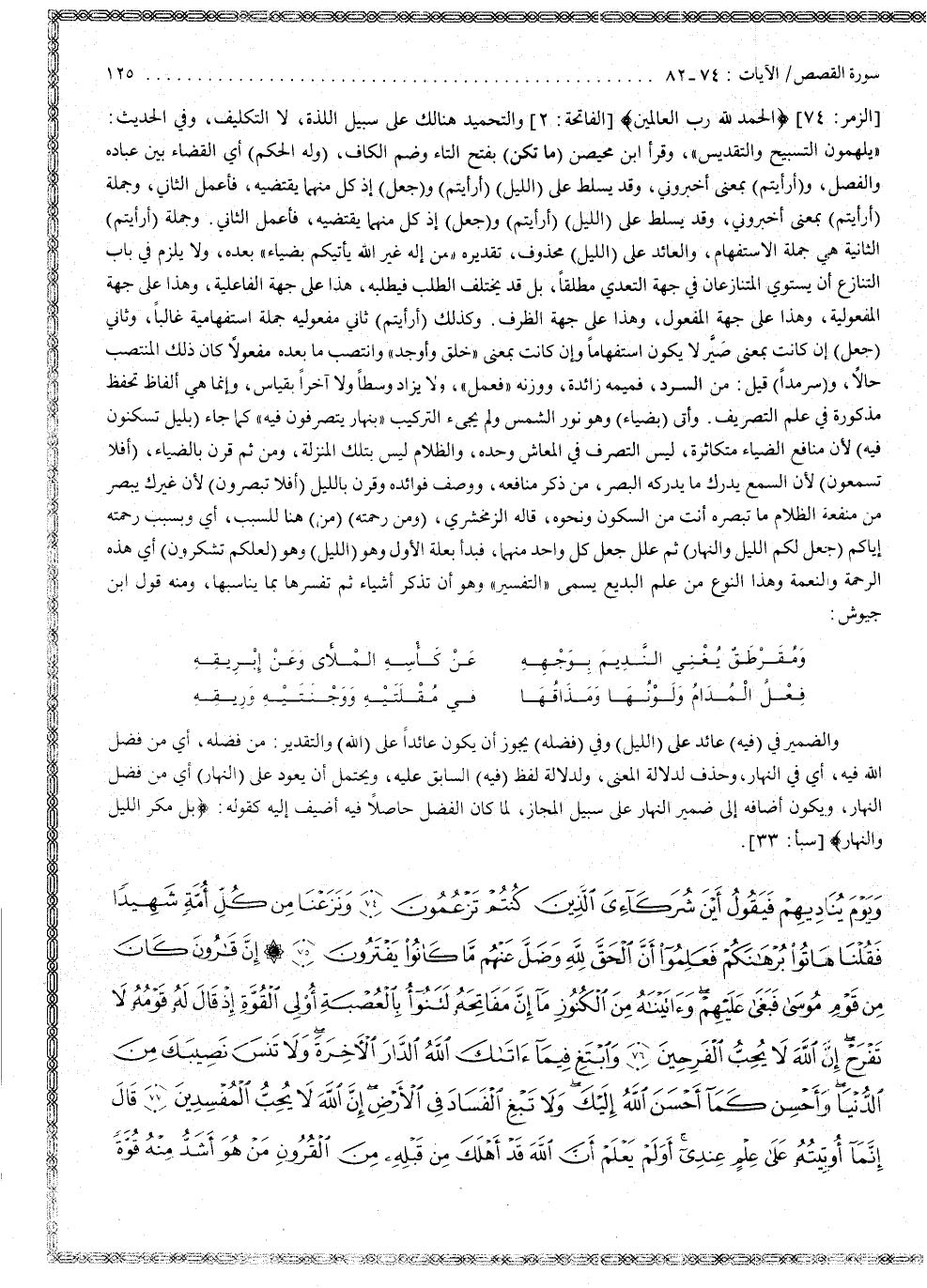 ) وَيَوْمَ يُنَادِيهِمْ فَيَقُولُ أَيْنَ شُرَكَائِىَ الَّذِينَ كُنتُمْ تَزْعُمُونَ وَنَزَعْنَا مِن كُلّ أُمَّةٍ شَهِيداً فَقُلْنَا هَاتُواْ بُرْهَانَكُمْ فَعَلِمُواْ أَنَّ الْحَقَّ لِلَّهِ وَضَلَّ عَنْهُمْ مَّا كَانُواْ يَفْتَرُونَ إِنَّ قَارُونَ كُلٌّ مّنَ قَوْمِ مُوسَى فَبَغَى عَلَيْهِمْ وَءاتَيْنَاهُ مِنَ الْكُنُوزِ مَا إِنَّ مَفَاتِحَهُ لَتَنُوأُ بِالْعُصْبَةِ أُوْلِى الْقُوَّةِ إِذْ قَالَ لَهُ قَوْمُهُ لاَ ( سقط : لا تفرح إن الله لا يحب الفرحين إلى آخر الآية ) ).