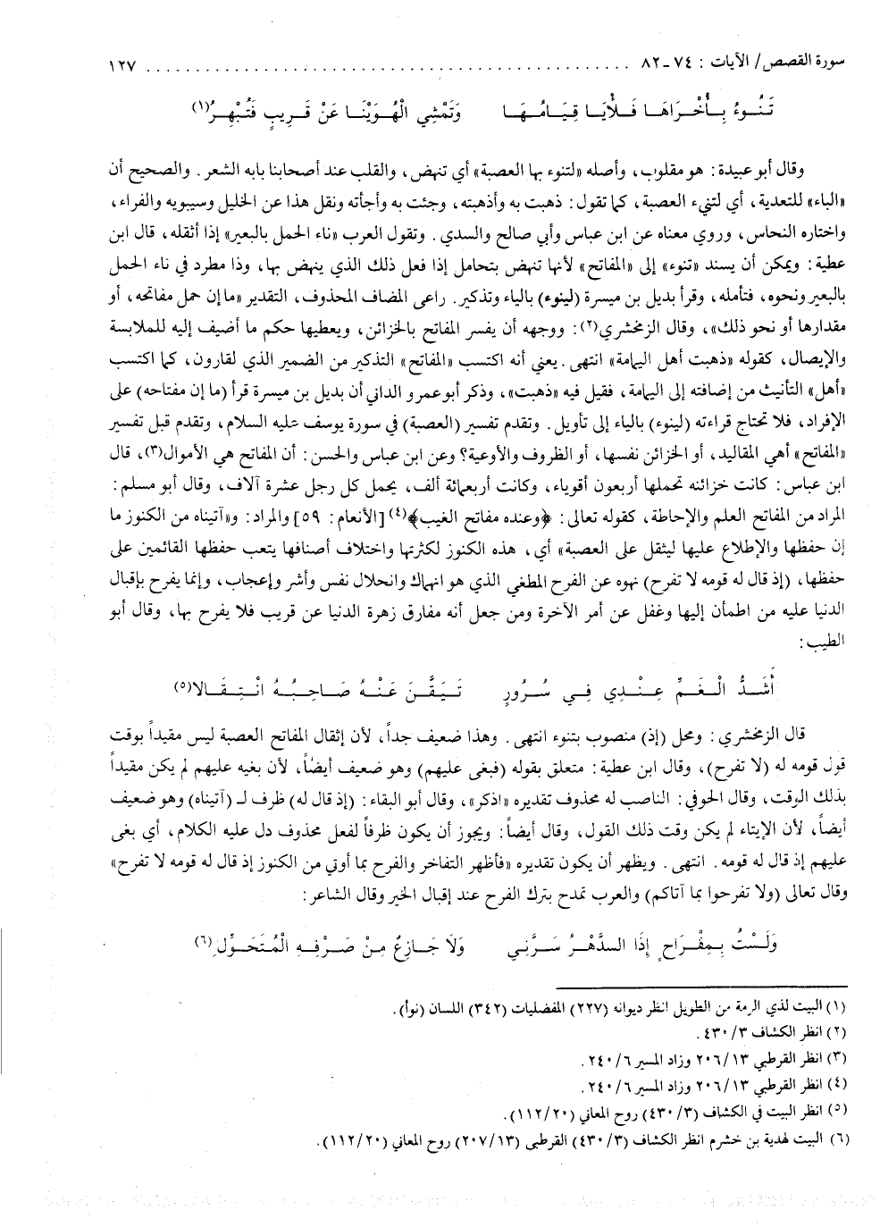وقال أبو عبيدة : هو مقلوب وأصله : لتنوء بها العصبة ، أي تنهض ، والقلب عند أصحابنا بابه الشعر . والصحيح أن الباء للتعدية ، أي لتنيء العصبة ، كما تقول : ذهبت به وأذهبته ، وجئت به وأجأته . ونقل هذا عن الخليل وسيبويه والفراء ، واختاره النحاس ، وروي معناه عن ابن عباس وأبي صالح والسدي ، وتقول العرب : ناء الحمل بالبعير إذا أثقله . قال ابن عطية : ويمكن أن يسند تنوء إلى المفاتح ، لأنها تنهض بتحامل إذا فعل ذلك الذي ينهض بها ، وذا مطرد في ناء الحمل بالبعير ونحوه ، فتأمله . وقرأ بديل بن ميسرة : لينوء ، بالياء ، وتذكيره راعى المضاف المحذوف ، التقدير : ما إن حمل مفاتحه ، أو مقدارها ، أو نحو ذلك . وقال الزمخشري : ووجهه أن يفسر المفاتح بالخزائن ، ويعطيها حكم ما أضيف إليه للملابسة والإيصال ، كقوله : ذهبت أهل اليمامة . انتهى . يعني : أنه اكتسب المفاتح التذكير من الضمير الذي لقارون ، كما اكتسب أهل التأنيث من إضافته إلى اليمامة ، فقيل فيه ، ذهبت . وذكر أبو عمرو الداني أن بديل بن ميسرة قرأ : ما إن مفتاحه ، على الإفراد ، فلا تحتاج قراءته لينوء بالياء إلى تأويل . وتقدم تفسير العصبة في سورة يوسف عليه السلام . وتقدم قبل تفسير المفاتح ، أهي المقاليد ، أو الخزائن نفسها ، أو الظروف والأوعية ؟ وعن ابن عباس والحسن : أن المفاتح هي الأموال .