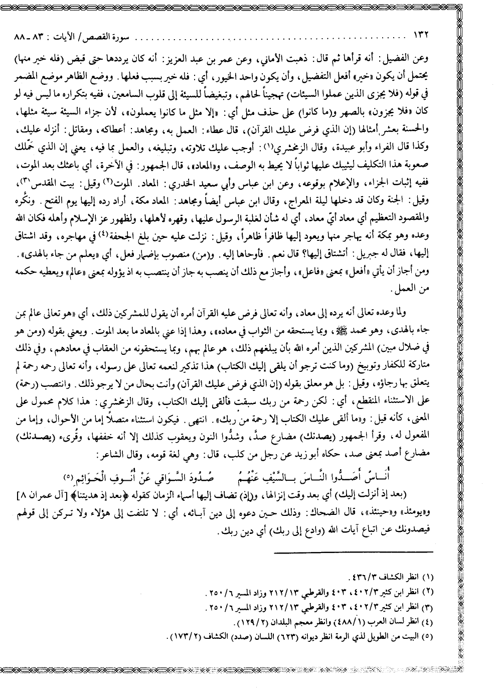 ( إِنَّ الَّذِى فَرَضَ عَلَيْكَ الْقُرْءانَ ( ، قال عطاء : العمل به ؛ ومجاهد : أعطاكه ؛ ومقاتل : أنزله عليك ، وكذا قال الفراء وأبو عبيدة . وقال الزمخشري : أوجب عليك تلاوته وتبليغه والعمل بما فيه ؛ يعني أن الذي حملك صعوبة هذا التكليف ليثيبك عليها ثواباً لا يحيط به الوصف . والمعاد ، قال الجمهور : في الآخرة ، أي باعثك بعد الموت ، ففيه إثبات الجزاء والإعلام بوقوعه . وعن ابن عباس ، وأبي سعيد الخدري : المعاد : الموت . وقيل : بيت المقدس . وقيل : الجنة ، وكان قد دخلها ليلة المعراج . وقال ابن عباس أيضاً ، ومجاهد : المعاد : مكة ، أراد رده إليها يوم الفتح ، ونكره ، والمقصود التعظيم ، أي معاد أي معاد ، أي له شأن لغلبة الرسول عليها وقهره لأهلها ، ولظهور عز الإسلام وأهله ، فكأن الله وعده وهو بمكة أنه يهاجر منها ويعود إليها ظافراً ظاهراً . وقيل : نزلت عليه حين بلغ الجحفة في مهاجره ، وقد اشتاق إليها ، فقال له جبريل : أتشتاق إليها ؟ قال : نعم ، فأوحاها إليه . ومن منصوب بإضمار فعل ، أي يعلم من جاء بالهدى ، ومن أجاز أن يأتي أفعل بمعنى فاعل ، وأجاز مع ذلك أن ينصب به ، جاز أن ينتصب به ، إذ يؤوله بمعنى عالم ، ويعطيه حكمه من العمل .