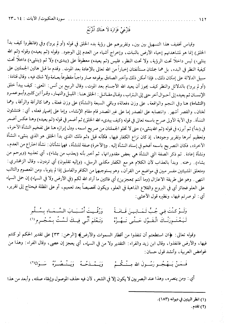 وفي الآية الأولى صرح باسمه تعالى في قوله : ) كَيْفَ يُبْدِىء اللَّهُ الْخَلْقَ ثُمَّ يُبْدِىء اللَّهُ الْخَلْقَ ثُمَّ يُعِيدُهُ ( ، وهنا عكس أضمر في بدا ثم أبرزه في قوله : ) ثُمَّ اللَّهُ يُنشِىء ( ، حتى لا تخلو الجملتان من صريح اسمه . ودل إبرازه هنا على تفخيم النشأة الآخرة وتعظيم أمرها وتقرير وجودها ، إذ كان نزاع الكفار فيها ، فكأنه قيل : ثم ذلك الذي بدأ الخلق هو الذي ) يُنشِىء النَّشْأَةَ الاْخِرَةَ ( ، فكان التصريح باسمه أفخم في إسناد النشأة إليه . والآخرة صفة للنشأة ، فهما نشأتان : نشأة اختراع من العدم ، ونشأة إعادة . ثم ذكر الصفة التي النشأة هي بعض مقدوراتها . ثم أخبر بأنه ) يُعَذّبُ مَن يَشَاء ( ، أي تعذيبه ، ( وَيَرْحَمُ مَن يَشَاء ( رحمته ، وبدأ بالعذاب ، لأن الكلام هو مع الكفار مكذبي الرسل . ) وَإِلَيْهِ تُقْلَبُونَ ( : أي تردون . وقال الزمخشري : ومتعلق المشيئتين مفسر مبين في مواضع من القرآن ، وهو يستوجبهما من الكافر والفاسق إذا لم يتوبا ، ومن المعصوم والتائب . انتهى ، وهو على طريقة الاعتزال . ) وَمَا أَنتُم بِمُعْجِزِينَ ( : أي فائتين ما أراد الله لكم . ) فِي الاْرْضِ وَلاَ فِى السَّمَاء ( ، إن حمل السماء على العلو فجائز ، أي في البروج والقلاع الذاهبة في العلو ، ويكون تخصيصاً بعد تعميم ، أو على المظلة ، فيحتاج إلى تقرير ، أي لو صرتم فيها ، ونظيره قول الأعشى : ولو كنت في جب ثمانين قامة