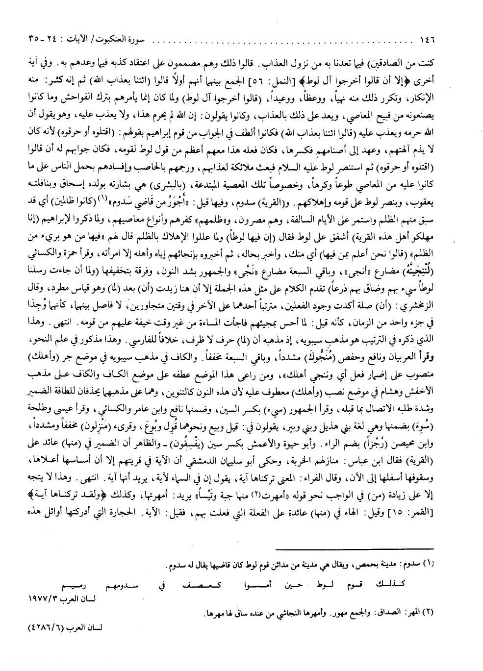 ( الْغَابِرِينَ وَلَمَّا أَن جَاءتْ رُسُلُنَا لُوطاً سِىء بِهِمْ وَضَاقَ بِهِمْ ذَرْعاً ( : تقدم الكلام على مثل هذه الجملة ، إلاّ أن هنا زيدت ، أن بعد لما ، وهو قياس مطرد . وقال الزمخشري أن صلة أكدت وجود الفعلين مترتباً أحدهما على الآخر في وقتين متجاورين لا فاصل بينهما ، كأنهما وجدا في جزء واحد من الزمان ، كأنه قيل : لما أحس بمجيئهم ، فاجأت المساءة من غير وقت خيفة عليهم من قومه . انتهى . وهذا الذي ذكره في الترتيب هو مذهب سيبويه ، إذ مذهبه . أن لما : حرف لا ظرف ، خلافاً للفارسي ، وهذا مذكور في علم النحو . وقرأ العربيان ، ونافع ، وحفص : ) مُنَجُّوكَ ( ، مشدداً ؛ وباقي السبعة : مخففاً ، والكاف في مذهب سيبويه في موضع جر . ) وَأَهْلَكَ ( : منصوب على إضمار فعل ، أي وننجي أهلك . ومن راعى هذا الموضع ، عطفه على موضع الكاف ، والكاف على مذهب الأخفش وهشام في موضع نصب ، وأهلك معطوف عليه ، لأن هذه النون كالتنوين ، وهما على مذهبهما يحذفان للطافة الضمير وشدة طلبه الاتصال بما قبله . وقرأ الجمهور : سيء ، بكسر السين ؛ وضمها نافع وابن عامر والكسائي . وقرأ عيسى ، وطلحة : سوء ، بضمهما ، وهي لغة بني هذيل . وبني وبير يقولون في قيل وبيع ونحوهما : قول وبوع . وقرىء : منزلون ، مخففاً ومشدداً ؛ وابن محيصن : رجزاً ، بضم الراء ؛ وأبو حيوة والأعمش : بكسر سين يفسقون . والظاهر أن الضمير في منها عائد على القرية ، فقال ابن عباس : منازلهم الخربة . وحكى أبو سليمان الدمشقي أن الآية في قريتهم ، إلا أن أساسها أعلاها ، وسقوفها أسفلها إلى الآن . وقال الفراء : المعنى تركناها آية ، يقول : إن في السماء لآية ، يريد أنها آية . انتهى ، وهذا لا يتجه إلا على زيادة من في الواجب ، نحو قوله : أمهرت منها جبة وتيساً ، يريد : أمهرتها ؛ وكذلك : ولقد تركناها آية ، وقيل : الهاء في منها عائدة على الفعلة التي فعلت بهم ، فقيل : الآية : الحجارة التي أدركتها أوائل هذه