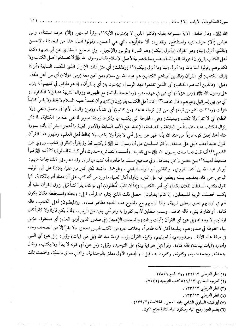 الله ( صلى الله عليه وسلم ) ) . وقال قتادة : الآية منسوخة بقوله : ) قَاتِلُواْ الَّذِينَ لاَ يُؤْمِنُونَ ( الآية . وقرأ الجمهور : إلا ، حرف استثناء ؛ وابن عباس : ألا ، حرف تنبيه واستفتاح ، وتقديره : ألا جادلوهم بالتي هي أحسن . ) وَقُولُواْ ءامَنَّا ( : هذا من المجادلة بالأحسن . ) بِالَّذِى أُنزِلَ إِلَيْنَا ( ، وهو القرآن ، ( وَأُنزِلَ إِلَيْكُمْ ( ، وهو التوراة والزبور والإنجيل .