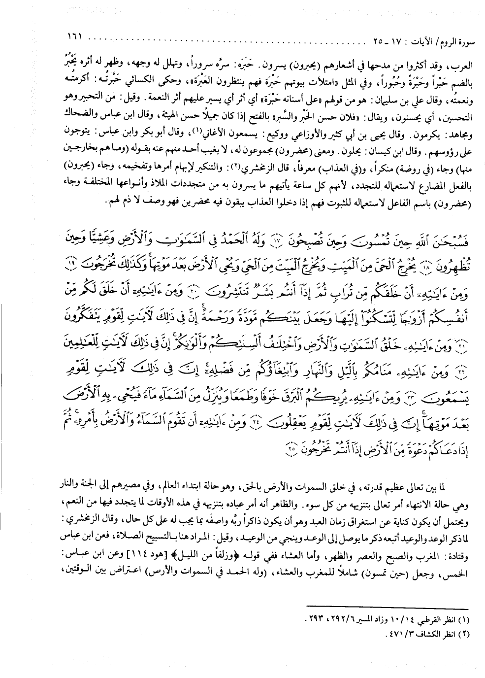 وقال الزمخشري : لما ذكر الوعد والوعيد ، أتبعه ذكر ما يوصل إلى الوعد وينجي من الوعيد . وقيل : المراد هنا بالتسبيح : الصلاة . فعن ابن عباس وقتادة : المغرب والصبح والعصر والظهر ، وأما العشاء ففي قوله : ) وَزُلَفاً مِّنَ الَّيْلِ ). وعن ابن عباس : الخمس ، وجعل ) حِينَ تُمْسُونَ ( شاملاً للمغرب والعشاء . ) وَلَهُ الْحَمْدُ فِى السَّمَاوَاتِ وَالاْرْضَ ( : اعتراض بين الوقتين ،