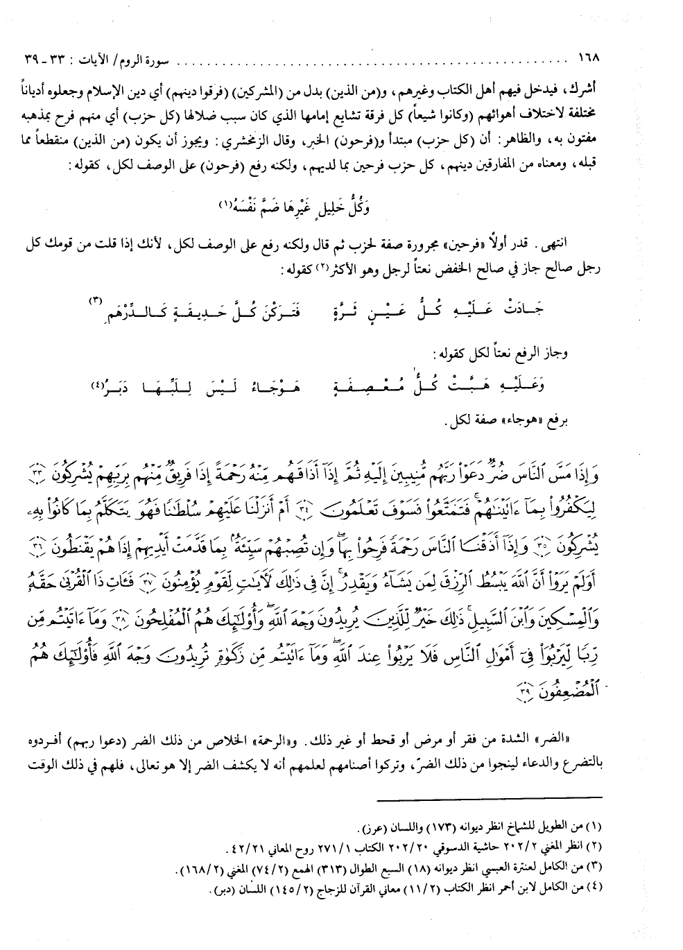 انتهى . قدر أولاً فرحين مجرورة صفة لحزب ، ثم قال : ولكنه رفع على الوصف لكل ، لأنك إذا قلت : من قومك كل رجل صالح ، جاز في صالح الخفض نعتاً لرجل ، وهو الأكثر ، كقوله : جادت عليه كل عين ترة