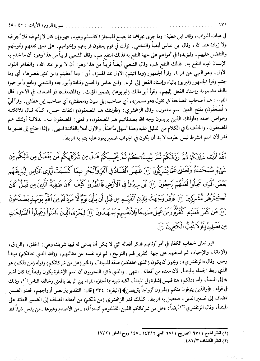 كرر تعالى خطاب الكفار في أمر أوثانهم ، فذكر أفعاله التي لا يمكن أن يدعى له فيها شريك ، وهي الخلق والرزق والإماتة والإحياء ، ثم استفهم على جهة التقرير لهم والتوبيخ ، ثم نزه نفسه عن مقالتهم . و ) اللَّهُ الَّذِى خَلَقَكُمْ ( : مبتدأ وخبر . وقال الزمخشري : ويجوز أن يكون ) الَّذِى خَلَقَكُمْ ( صفة للمبتدأ ، والخبر : ) هَلْ مِن شُرَكَائِكُمْ ( ؛ وقوله : ) مّن ذالِكُمُ ( هو الذي ربط الجملة بالمبتدأ لأن معناه : من أفعاله . انتهى . والذي ذكره النحويون أن اسم الإشارة يكون رابطاً إذا كان أشير به إلى المبتدأ . وأما ) ذالِكُمْ ( هنا فليس إشارة إلى المبتدأ ، لكنه شبيه بما أجازه الفراء من الربط بالمعنى ، وخالفه الناس ، وذلك في قوله : ) وَالَّذِينَ يُتَوَفَّوْنَ مِنكُمْ وَيَذَرُونَ أَزْواجًا يَتَرَبَّصْنَ ( ، قال التقدير : يتربصن أزواجهم ، فقدر الضمير بمضاف إلى ضمير الذين ، فحصل به الربط ، كذلك قدر الزمخشري ) مّن ذالِكُمُ ( : من أفعاله المضاف إلى الضمير العائد على المبتدأ . وقال الزمخشري أيضاً : هل من شركائكم الذين اتخذتموهم أنداداً له من الأصنام وغيرها من يفعل شيئاً ، قط